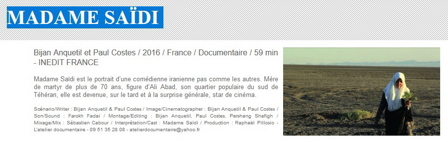 D’abord Madame Saïdi de Bijan Anquetil et Paul Costes. Les deux réalisateurs, persanophones et auteurs d’un film sur les affiches de martyrs dans les rues de Téhéran en 2007, ont réussi un documentaire comique autour d’une des femmes les plus pénibles de l’univers. Totalement inconnue chez nous Halimé Saïdi l’était également du public iranien en 2007 lorsqu’elle a alpagué les deux hommes dans la rue en se prétendant actrice. Mais en quelques années les choses ont bien changé, la faute à un programme TV qui a l’air aussi débile que les nôtres : Khosh Neshin Ha – par conséquent vecteur d’une starification maladive et superficielle. Preuve que dans toutes les cultures la télévision affaiblit les esprits. En revenant en Iran en 2014, pour en faire le portrait, sans même connaître le nouveau statut de la vieille dame, les deux cinéastes se sont retrouvés face à une personnalité forte qui leur a permis à la fois de produire un moyen-métrage dans lequel le pacte documentaire est bien affiché, ce qui leur permet d’articuler sans langue de bois les liens entre spectacle (les lecteurs de Debord peuvent reprendre ici le concept à leur sauce), religion et gouvernement. Car madame Saïdi est certes actrice mais documentaire ou fiction, pour elle, tout est similaire puisqu’elle incarne toujours son propre rôle en y adjoignant une pointe d’humour. Du coup, elle veut être payée. Elle n’en démord pas même si le documentaire, lui permettant de faire à manger et le ménage tout en étant filmée, l’arrange bien. Ni elle, ni nous ne savons vraiment quand elle joue. Elle reproduit d’ailleurs sa vie quotidienne – avec monnaie à la clé pour produire des discours en l’honneur des familles de martyrs, elle-même étant mère d’un enfant mort pendant la guerre, dans des lieux de culte du pays – pour la rendre intéressante devant la caméra. Et surtout, les réalisateurs s’amusent de ce personnage aussi loufoque que tragique en la mettant aux prise dans une dernière séquence magistrale avec un véritable acteur iranien, devenu chauffeur de taxi pour l’occasion.