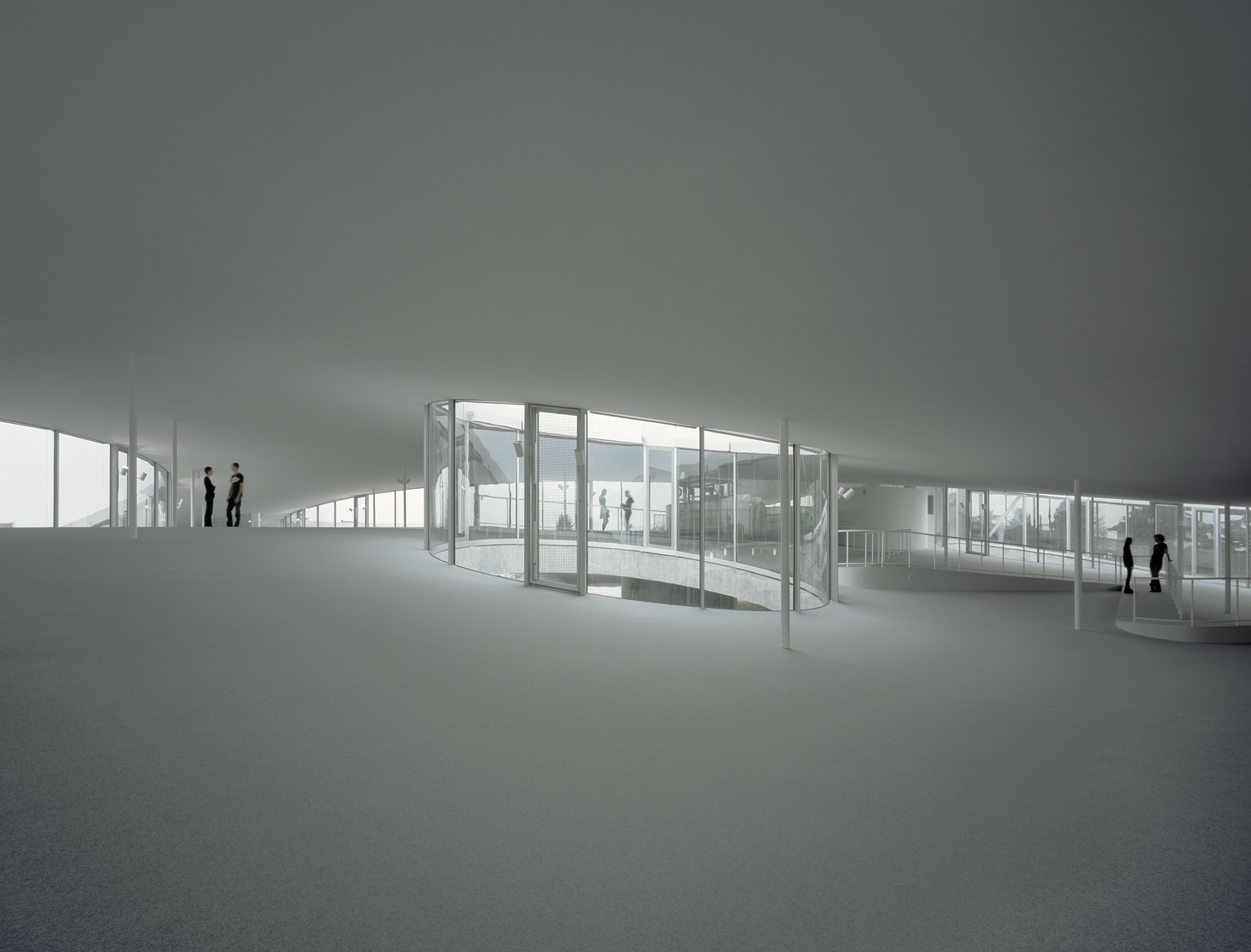 Citons à notre tour l’auteur de Nadja : « Pour moi, je continuerai à habiter ma maison de verre, où l’on peut voir à toute heure qui vient me rendre visite, où tout ce qui est suspendu aux plafonds et aux murs tient comme par enchantement, où je repose la nuit sur un lit de verre aux draps de verre, où qui je suis m’apparaîtra tôt ou tard gravé au diamant. » Quête de soi et transparence. Le jour, dans son lieu de travail, espace social, Marc évolue dans une architecture transparente, à la vue de tous. Absolument cinématographique, le bâtiment Rolex Learning Center de Lausanne anime le film, telle une manifestation organique. Il a été pour les frères Larrieu une véritable inspiration, accordant aux décors une place capitale, comme naissance du désir de film. Chaque lieu est une surprise architecturale, recélant pour la caméra un vaste possible formel facétieux, une multitude de facettes et recoins à explorer, dégageant un sens troublant -chaque ligne comme un écho, chaque mur réfléchissant les intrigues et les angoisses où se débattent en son sein les personnages aculés. Immaculé comme la blancheur éclatante de la neige qui l’entoure et qui submerge l’écran, l’université affiche une innocence et une pureté ostentatoires. Mais lorsque la neige fond, elle peut dévoiler mort et férocité dérangeantes. Dans ce lieu où rien ne peut être caché, où tout le monde épie tout le monde, se tisse un univers plus obscur et poisseux, celui du mensonge et de la duplicité. De la transparence naît le reflet, la forme éclatée et schizophrénique. Des doubles jaillissent. Le blanc qui envahit l’écran semble aussi grignoter le cerveau de Marc, il annule la mémoire, ses actes et son identité sont perdus et happés dans ce vide. Il appelle à l’horreur comme les personnages d’Un roi sans divertissement de Jean Giono, fascinés par la couleur du sang sur la neige. Architecture et paysage se reflètent, rivalisent et s’imbriquent l’un dans l’autre.
