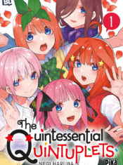 Dans le petit monde de la romance adolescente, The Quintessentials Quintuplets se démarque par le biais d’une pirouette scénaristique amusante : le jeune héros se retrouve face non pas à une seule lycéenne qui emballe son cœur, mais face à des quintuplées, qui plus est monozygotes. Cinq filles, cinq personnalités, mais une seule et même apparence, comme s’en rendra compte le jeune Fûtarô, notre héros – les sœurs ne se distinguent l’une de l’autre que par quelques petites coquetteries (une paire d’écouteurs autour du cou, un nœud ou deux barrettes dans les cheveux, etc). Un seul garçon au milieu de plein de meufs, avec une intrigue amoureuse et même un mariage à la clé – comme le suggèrent certaines images de cette histoire, qui nous est racontée sous la forme de flashbacks – c’est bien sûr un schéma classique du genre, qui avait été exploité il y a vingt ans par Ken Akamatsu sur Love Hina. Cependant, Negi Haruba parvient à tirer son épingle du jeu avec The Quintessentials Quintuplets, notamment à travers un subtil jeu d’oppositions, qui se retrouvent non seulement dans le fait que Fûtarô se retrouve à devoir faire la classe à cinq cancres n’ayant aucune envie d’apprendre, mais également dans le fait que les quintuplées sont issues d’un milieu très aisé quand lui doit calculer au Yen près, ne serait-ce que pour manger à la cantine. Une bonne surprise, donc !