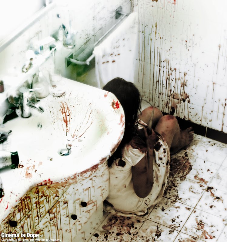 À l’intérieur, c’est tout d’abord un scénario et une intrigue totalement centrés sur 2 femmes, Béatrice Dalle et Alysson Paradis (la sœur de Vanessa Paradis), chose assez rare dans le cinéma d’horreur. L’entrée dans le film se fait de manière brusque, même le générique met mal à l’aise. Puis après avoir planté le décor violemment, l’action se calme et on suit Sarah qui prépare son accouchement, mais le spectateur se doute bien que le pire va bientôt arriver. Ensuite apparaît une mystérieuse femme qui tourne autour de la maison de Sarah. On ne comprend pas ce qu’il se passe, un coté mystique et mystérieux se dégage de cette femme et nous fait frémir. Les jeux d’ombre, le silence et l’ambiance sont des plus réussis. Le meilleur passage : Sarah s’endort sur son canapé et derrière elle l’ombre de la tueuse grandit et s’approche jusqu’à ce que le chat effrayé miaule et réveille la jeune femme. Splendide.