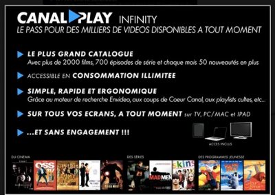 CanalPlay Infinity sera proposé à 9,99 € par mois avec un accès illimité à tous le catalogue Canal + (films et série TV disponible sur CanalPlay). Mais la grande nouvelle, c’est que ces vidéos seront visionnables à l’infini alors que jusqu’à présent, on ne pouvait les regarder que durant 48 heures. Une petite révolution dans le monde de la VOD qui pourrait bien faire mal à la concurrence. Cette nouvelle offre sera disponible dès jeudi prochain.