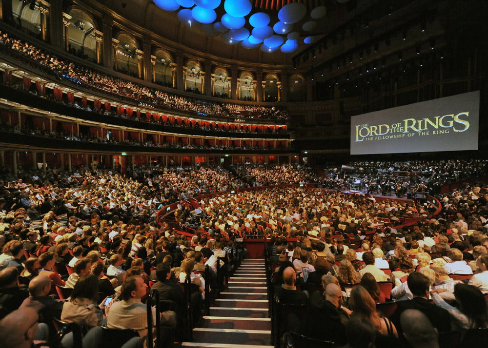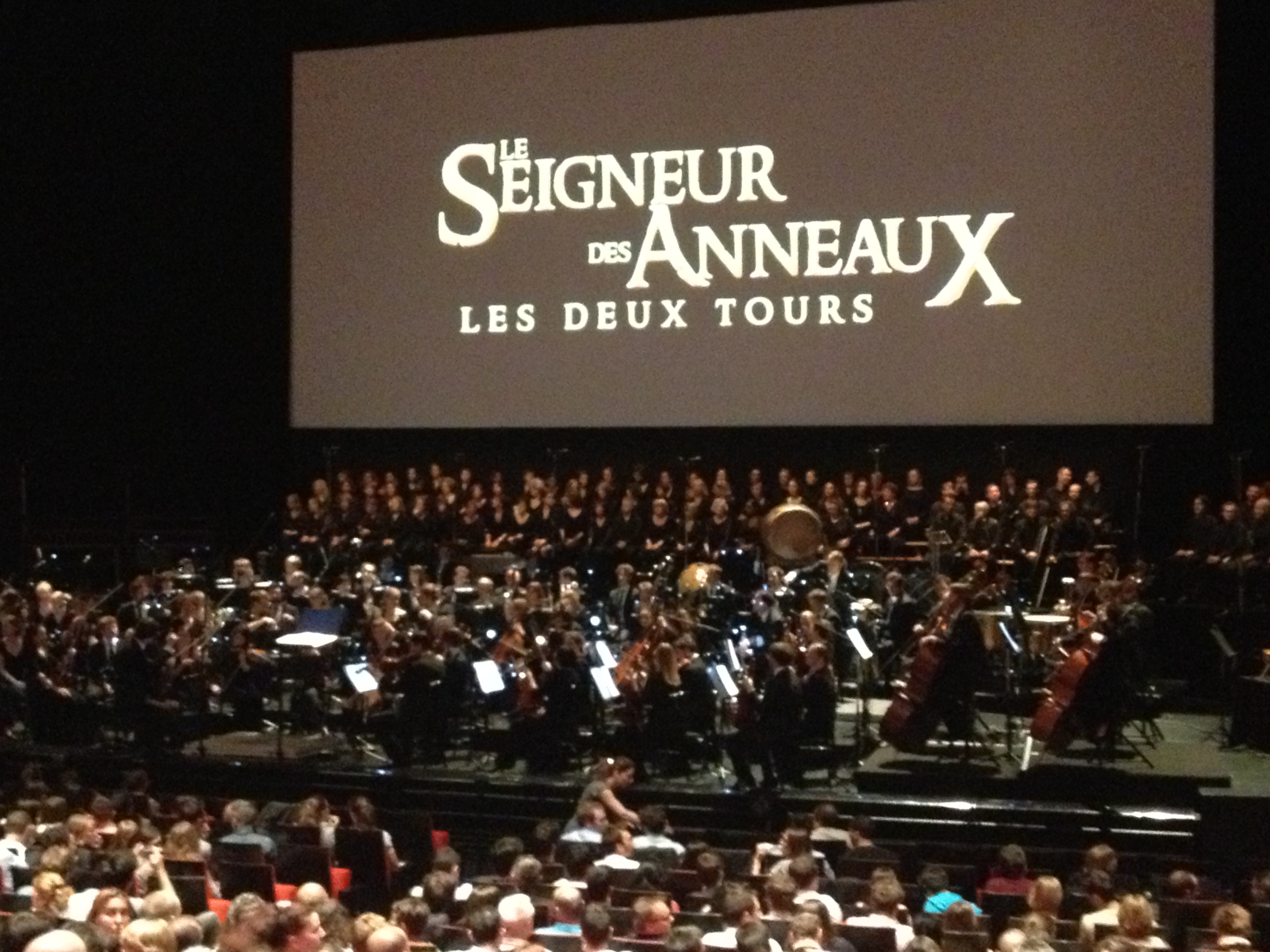 Conscient de ce travail titanesque d’une richesse incroyable (surtout pour de la musique de film, souvent considérée comme un parent un peu pauvre), et après l’édition d’intégrales des musiques du Seigneur des Anneaux, c’est tout naturellement que des producteurs décidèrent d’exporter cette musique afin d’être jouée sur scène devant public. Et quelle meilleure façon que de le faire devant le film qui l’a vue naître ! Après le triomphe l’année dernière du ciné-concert du Seigneur des Anneaux la Communauté de l’Anneau (qui était déjà passé par le Palais des Congrès de Paris), le producteur français de l’événement a décidé de réitérer l’expérience pour notre plus grand plaisir et pour la 2e partie de ce voyage musical. Projeté dans l’une des plus belles salles de la capitale sur un écran géant en fond de scène, le film est livré dans une copie dépourvue de bande musicale, uniquement avec les dialogues et les bruitages sonores. Toute la partition d’Howard Shore est interprétée en direct par deux cent artistes : un orchestre symphonique, des solistes et plusieurs choeurs dont un d’enfants. Et il est impressionnant de voir – et d’entendre – avec quelle précision le tout est synchronisé ! Déjà passé par Londres et New-York ainsi que Sydney et St Louis, le spectacle a déjà ravi des salles entières.