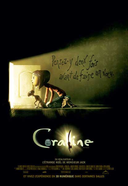 Synopsis : Coraline Jones, petite fille intrépide à la curiosité sans limites vient d’emménager avec ses parents dans une nouvelle maison. Une étrange maison. Ses parents n’ayant guère de temps à lui consacrer, Coraline explore sa nouvelle demeure jusqu’au jour où elle trouve une petite porte condamnée. Elle découvre ainsi un monde parallèle lui présentant sa nouvelle vie ; des «Autres parents» identiques aux siens, ayant tout leur temps à lui consacrer, des voisins toujours en fêtes, de la nourriture exquise et des loisirs à l’infini. Mais Coraline est bien loin d’imaginer que ce monde parallèle est en fait un monde cruel et inquiètant détenu par l’Autre Mère…