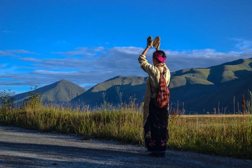 C’est accompagnée par deux amies que Drolma commence son pèlerinage. Attention, la très obstinée Drolma a décidé de faire le pèlerinage de Lhasa dans sa version la plus difficile, celle où le pèlerin se prosterne très, très régulièrement. Ce qu’elle entreprend n’est donc pas une banale randonnée genre Compostelle ou Fatima. Ce n’est pas, non plus, la montée à genoux du grand escalier des pèlerins à Rocamadour. C’est, en quelque sorte, la combinaison des deux : tout d’abord, la distance, plus de 1000 kilomètres à vol d’oiseau, plus de 2000 par la route ; ensuite, la façon de se déplacer tout au long du parcours : on fait 3 pas, on tape 3 fois dans ses mains, on se couche par terre, on fait un mouvement qui s’apparente à celui de la brasse, on se relève, on refait 3 pas, etc. Dans ces conditions, impossible d’espérer arriver dans un village à la fin de chaque journée ! Il faut donc prévoir le transport de tout l’équipement permettant de préparer sa nourriture et de dormir dans la nature en plus du reste, un transport impossible à effectuer soi-même lorsqu’on se prosterne tous les 3 pas, sauf à tripler la distance parcourue en avançant à chaque fois le matériel de 50 mètres, en revenant en arrière et en parcourant à nouveau ces 50 mètres, cette fois-ci façon pèlerin pur et dur. D’où la présence, au départ, des deux accompagnatrices, Dorje devant rester dans le village où le couple habite pour s’occuper de son père. Tout au long du parcours de Drolma, suivi de celui de Dorje et Norbu, il y aura des changements dans le « personnel » d’accompagnement : on y trouvera le frère de Drolma, Norbu, Dorje, qui a fini par trouver quelqu’un pour s’occuper de son père, et un jeune âne dont la mère vient de mourir.