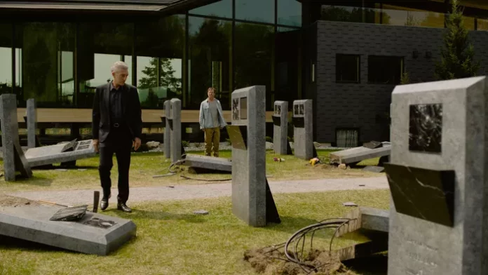 D’une manière générale, la mort n’a pas bonne presse et, afin d’en cacher la réalité, on s’empresse le plus souvent de dissimuler les cadavres aux yeux de tous à l’aide de ce qu’on a coutume d’appeler un linceul. Il faut avoir le cerveau un peu dérangé d’un Cronenberg pour imaginer un linceul connecté qui, loin de dissimuler le cadavre, permet aux personnes vivantes de rester en contact avec le défunt ou la défunte afin, en particulier, de suivre la décomposition de son corps. Il parait que cette idée morbide, David Cronenberg l’a eue en 2017, à la suite du décès de Carolyn Zeifman, son épouse, vaincue par un cancer. Dans Les linceuls, il met en scène Karsh, un homme d’affaire dans la cinquantaine, propriétaire de la moitié d’un cimetière et du restaurant qui le jouxte, un homme qui a perdu sa femme 6 ans auparavant et qui, depuis, est inconsolable. De toute façon, impossible pour cette défunte de religion juive de procéder à son incinération, l’explication donnée dans le film, mais qui n’est pas la seule, étant que, dans le religion juive, l’âme doit rester un long moment au dessus du corps en train de se décomposer. Un geek qu’il connait très bien va lui permettre de mettre en œuvre cette invention de cercueil connecté. Cette possibilité de rester en contact avec les disparu(e)s qu’on a aimé(e)s, il a décidé de la proposer à d’autres que lui, moyennant finance, bien évidemment, chaque acheteur pouvant donc suivre « son » mort dans ce cimetière connecté qu’il a créé, « son » mort, mais pas les autres morts. Ne voulant pas se limiter à un scénario basé uniquement sur la technologie et le morbide, David Cronenberg a ajouté un côté thriller à son film, en injectant des actes de vandalisme et de profanation se déroulant dans le cimetière connecté.