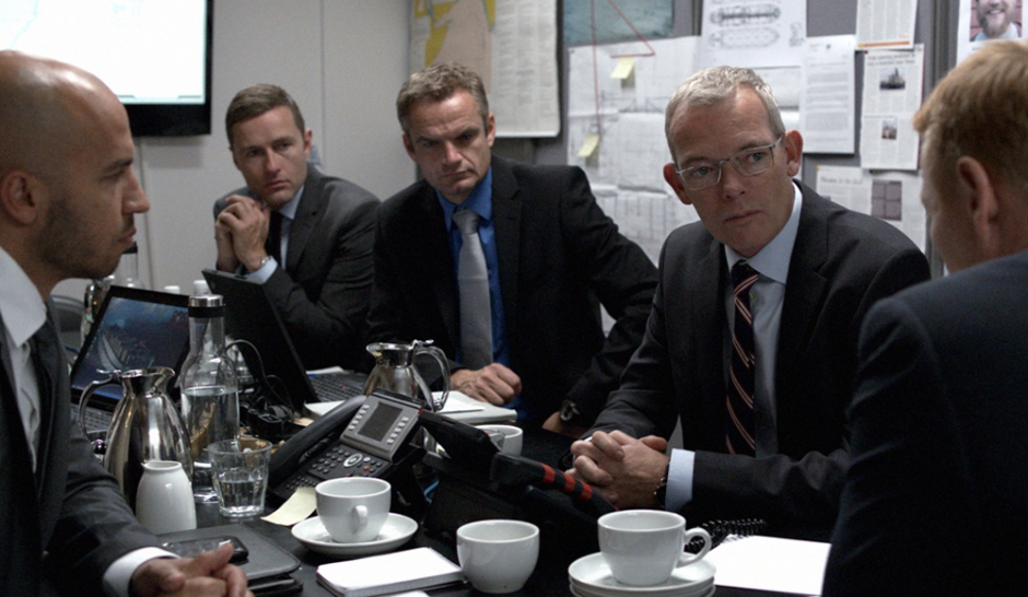 Que ce soit pour les états ou pour les compagnies privées, la prise d’otage suivie d’une demande de rançon se traduit inévitablement par un dilemme moral quasiment insoluble : céder sera forcément considéré comme un encouragement donné à cette pratique, ne pas céder sera considéré comme un choix consistant à donner une valeur plus importante à l’argent qu’à la vie humaine, surtout en cas de fin tragique. C’est cette problématique que le réalisateur danois Tobias Lindholm a choisi de porter à l’écran pour son 2ème long métrage : le cargo NV Rosen fait route vers Mumbai avec 7 hommes à bord lorsqu’il est pris d’assaut par un groupe de pirates somaliens qui, très vite, exigent une rançon de 15 milliards de dollars pour libérer le bateau et les hommes. Au Danemark, une cellule de crise est rapidement constituée pour mener les négociations, sous la houlette de Peter, le PDG de la compagnie à laquelle le cargo appartient, et de Connor, un expert en matière de négociations de ce type. Sur le bateau, le capitaine étant malade, c’est le cuisinier Mikkel qui représente l’équipage auprès d’Omar, le représentant des pirates, un homme qui se présente comme traducteur et qui refuse d’être considéré comme étant lui-même un preneur d’otage. A partir de ce moment, le film balance entre séquences sur le bateau et conciliabules au sein de la séance de crises, entrecoupés de conversations téléphoniques entre les 2 camps, conversations pendant lesquelles les protagonistes jouent les marchands de tapis en s’appellant par leurs prénoms et se demandant réciproquement « comment ça va ? ».
