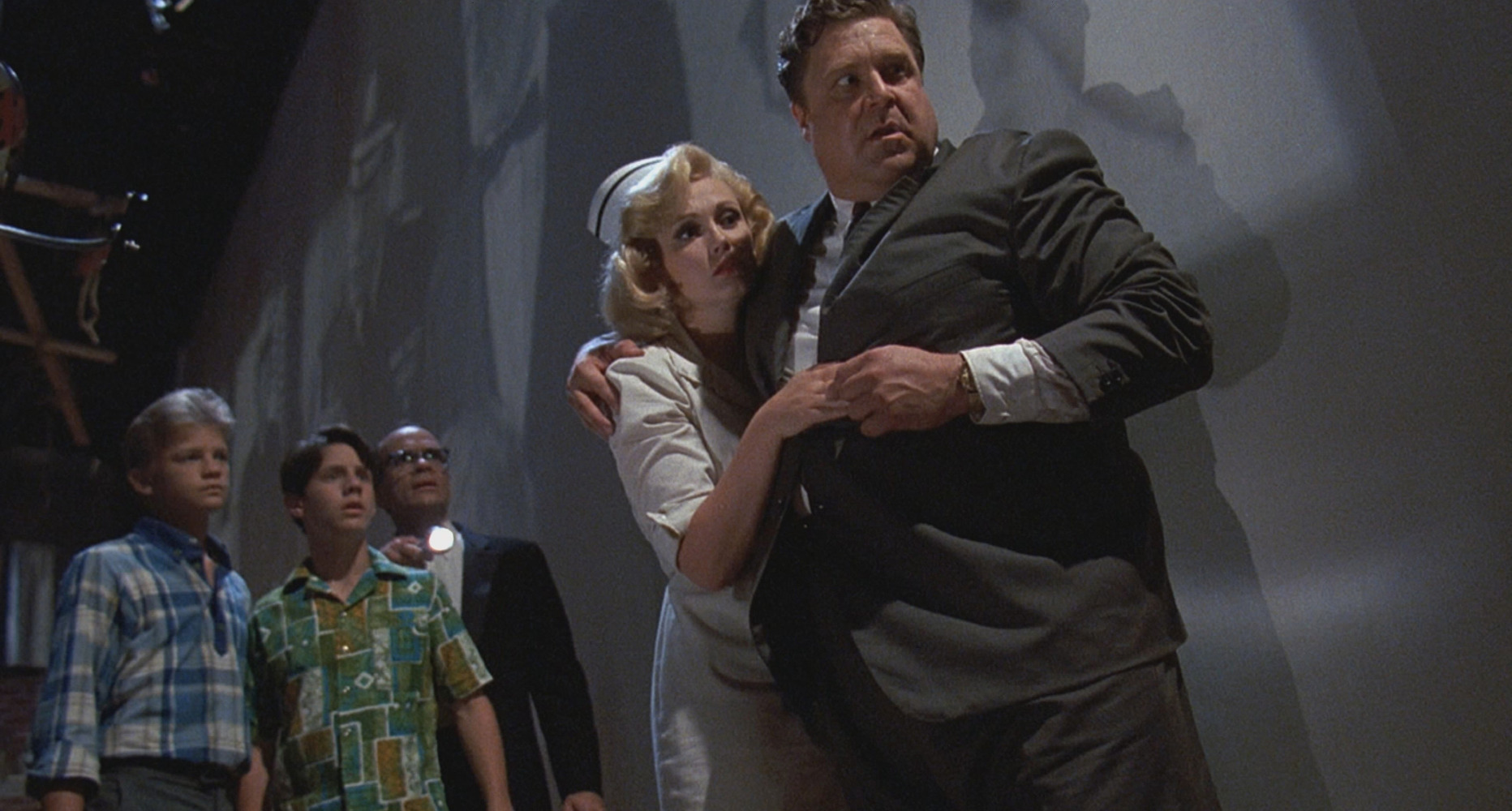 Jouant constamment sur la frontière entre réel ou imaginaire, en particulier lors de la séance du film dans le film « Mant ! », le long-métrage évoque la puissance de fascination et d’immersion du 7ème Art, manière pour les adolescents américains d’échapper un moment à la vague de peur et de paranoïa qui secoue la petite ville de Key West. Il est également l’occasion de découvrir un John Goodman littéralement ébouriffant, dans ce personnage de producteur excentrique, mégalo, à mi-chemin entre Alfred Hitchcock et Orson Welles, mais évoquant surtout William Castle, cinéaste beaucoup moins connu, réputé dans les 50’s pour avoir réalisé des séries B d’horreur et mis au point des procédés dans les salles de cinéma afin de surprendre le public et assurer le succès de ses œuvres.