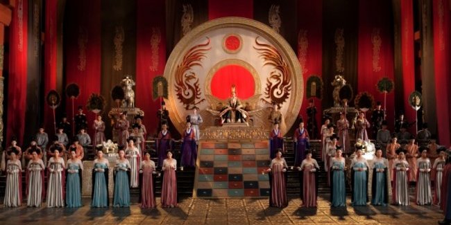 Par ailleurs, la féérie des décors et surtout des costumes participent à la beauté du film. La puissance de l’impératrice Wu Ze Tian passe par ses vêtements et parures colorés, dorés, sophistiqués et extravagants (elle fait construire un immense statue de Bouddha à son effigie), une symbiose parfaite entre elle et le lieu qu’elle habite.