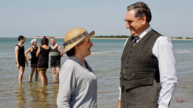 Mrs Hughes et Mr Carson se donnent la main sur une plage.
