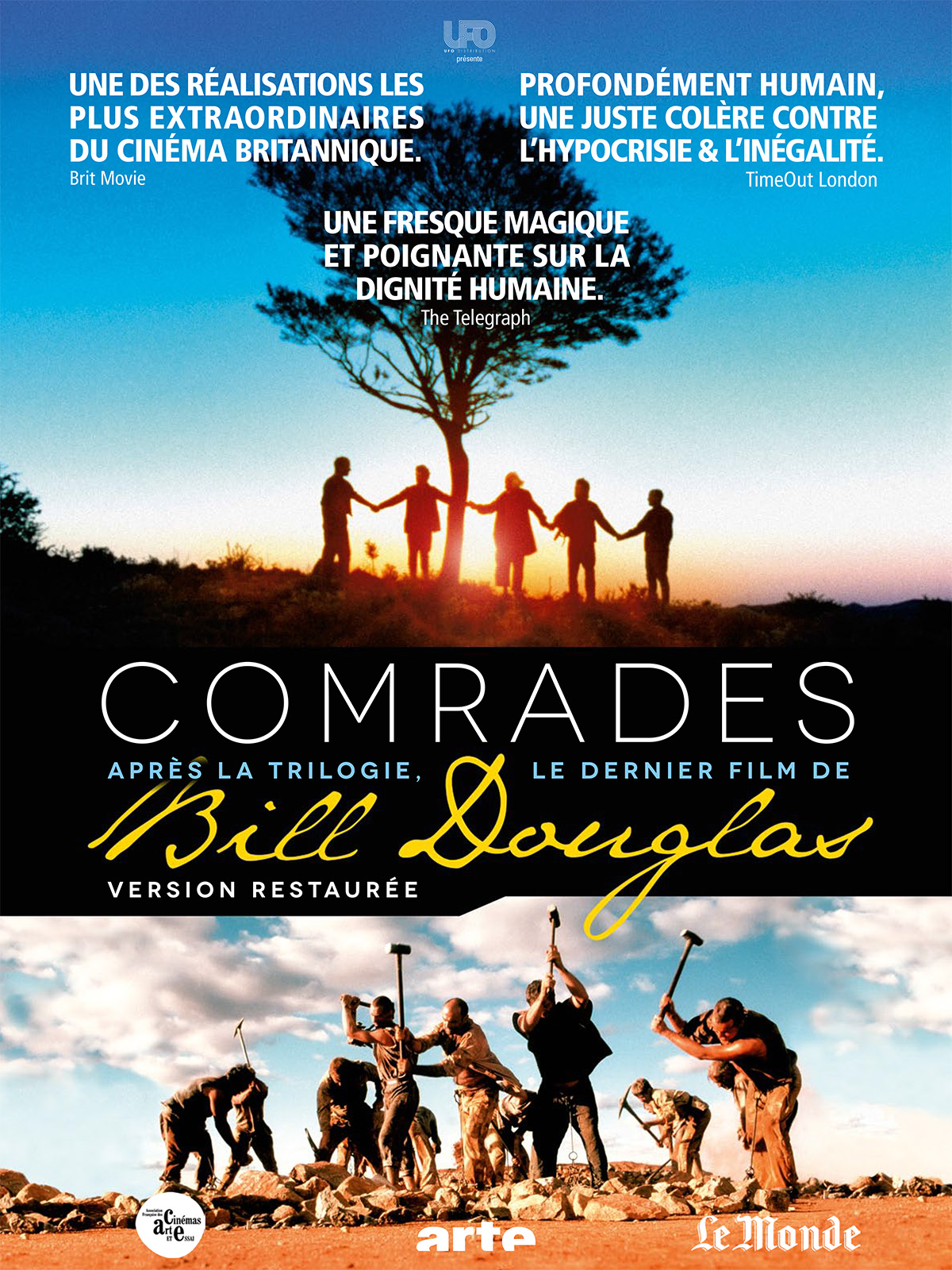 A côté de Ken Loach, la Grande-Bretagne a compté un autre grand cinéaste ayant la fibre sociale chevillée au corps. Né 2 ans seulement avant Ken Loach, en 1934, l’écossais Bill Douglas n’a malheureusement pas eu le temps de produire une œuvre importante quant à la quantité, ayant été emporté par un cancer à l’âge de 57 ans. Par contre ce qu’il nous a offert est de très grande qualité. Après sa trilogie en noir et blanc sur le début de sa vie, tournée entre 1972 et 1978, sortie sur nos écrans en juillet 2013 et en DVD en novembre 2013, c’est au tour de Comrades d’être enfin offert au public français, grâce à UFO, 28 ans après sa première projection au Festival du film de Londres. La sortie en salles a eu lieu en juillet dernier et le DVD est disponible depuis le 22 novembre. C’est une histoire vraie que nous raconte Comrades, l’histoire d’un groupe de laboureurs du Dorset qui se déroule dans les années 30 du 19ème siècle. Ces laboureurs, la France n’en a pas trop entendu parler mais, en Angleterre, ils sont connus sous le nom des martyrs de Tolpuddle. Figurez vous qu’en 1834, George et James Loveless, Thomas et John Stanfield, James Hammett et James Brine ont eu le culot de réclamer des augmentations de salaire et de fonder la Société amicale des laboureurs ! La riposte des propriétaires terriens fut immédiate et terrible : un tribunal dont on peut douter de l’objectivité condamna les 6 syndicalistes à la déportation en Australie. Il y resteront deux ans, entre travaux forcés et brimades. C’est tout cela que nous montre Bill Douglas dans Comrades, un film d’un peu plus de 3 heures et qui comprend trois séquences. La première est consacrée à la vie au village et dans les champs; la deuxième raconte le procès et la condamnation ; la troisième, enfin, décrit la vie des 6 forçats en Australie. Rien que cela aurait déjà pu donner un film de grand intérêt, mais dont les limites auraient pu résider dans un classicisme plus ou moins laborieux. Heureusement, Bill Douglas connaissait très bien l’histoire de l’image animée et, sachant donc que l’histoire qu’il allait raconter coïncidait dans le temps avec la naissance de divers procédés d’animation des images, il a eu l’idée géniale de mettre en scène, tout au long de son récit, des montreurs d’ombre itinérants, apparaissant chaque fois avec une nouvel équipement et tous joués par le même comédien, Alex Norton. Formellement, Comrades est un film d’une grande beauté esthétique, avec des scènes qui ressemblent à des tableaux. Après le noir et blanc de sa trilogie, Bill Douglas se montre un véritable maître de la couleur et on n’est pas prêt d’oublier la façon dont il filme les visages des protagonistes et les couleurs de l’Australie. On notera enfin que ce film magnifique sur l’émergence du syndicalisme en Angleterre a été tourné au moment même où Margaret Thatcher faisait voter, de 1980 à 1988, 5 lois de régression sociale sur les syndicats. Sûrement pas une coïncidence de la part de Bill Douglas.