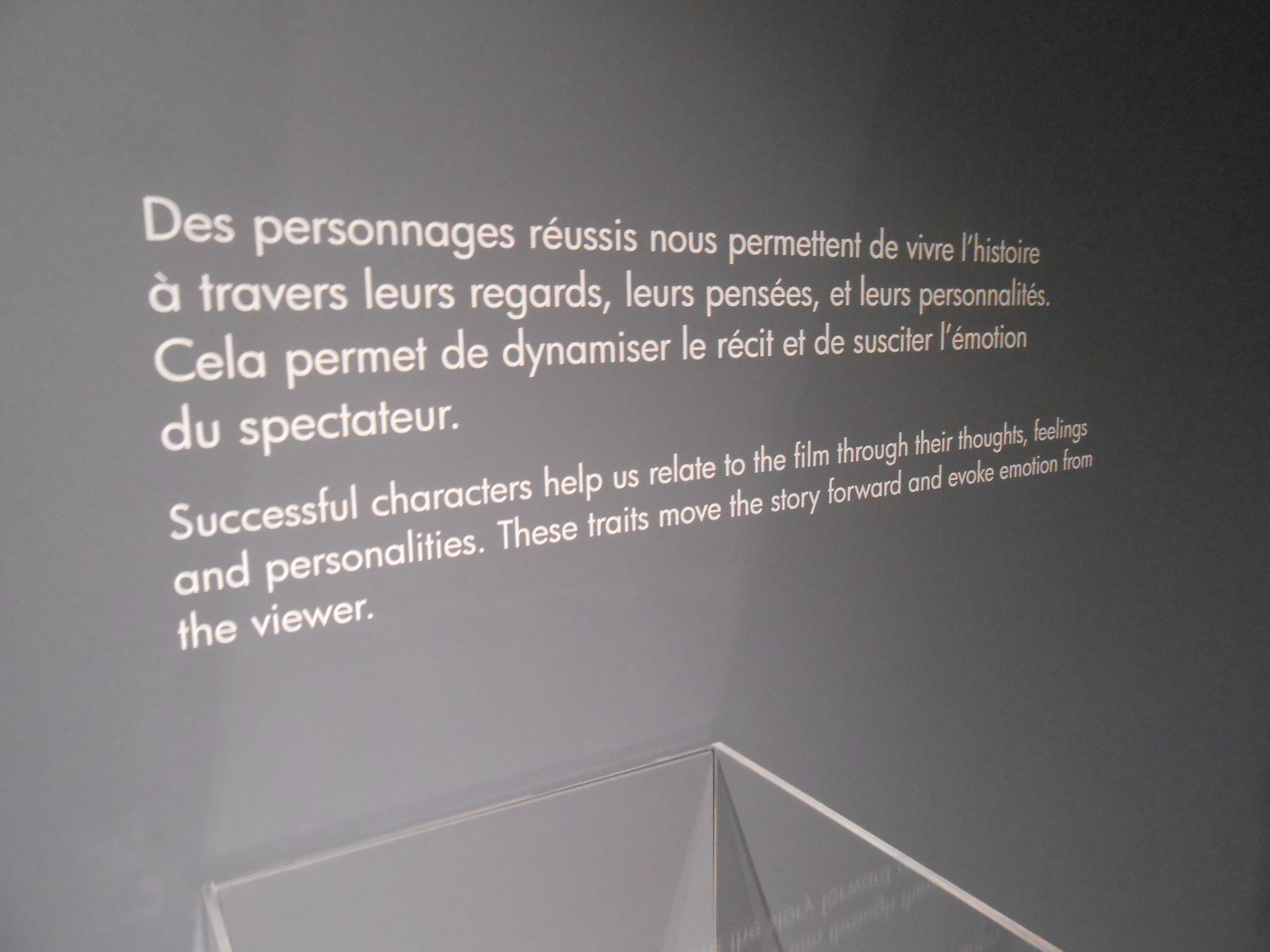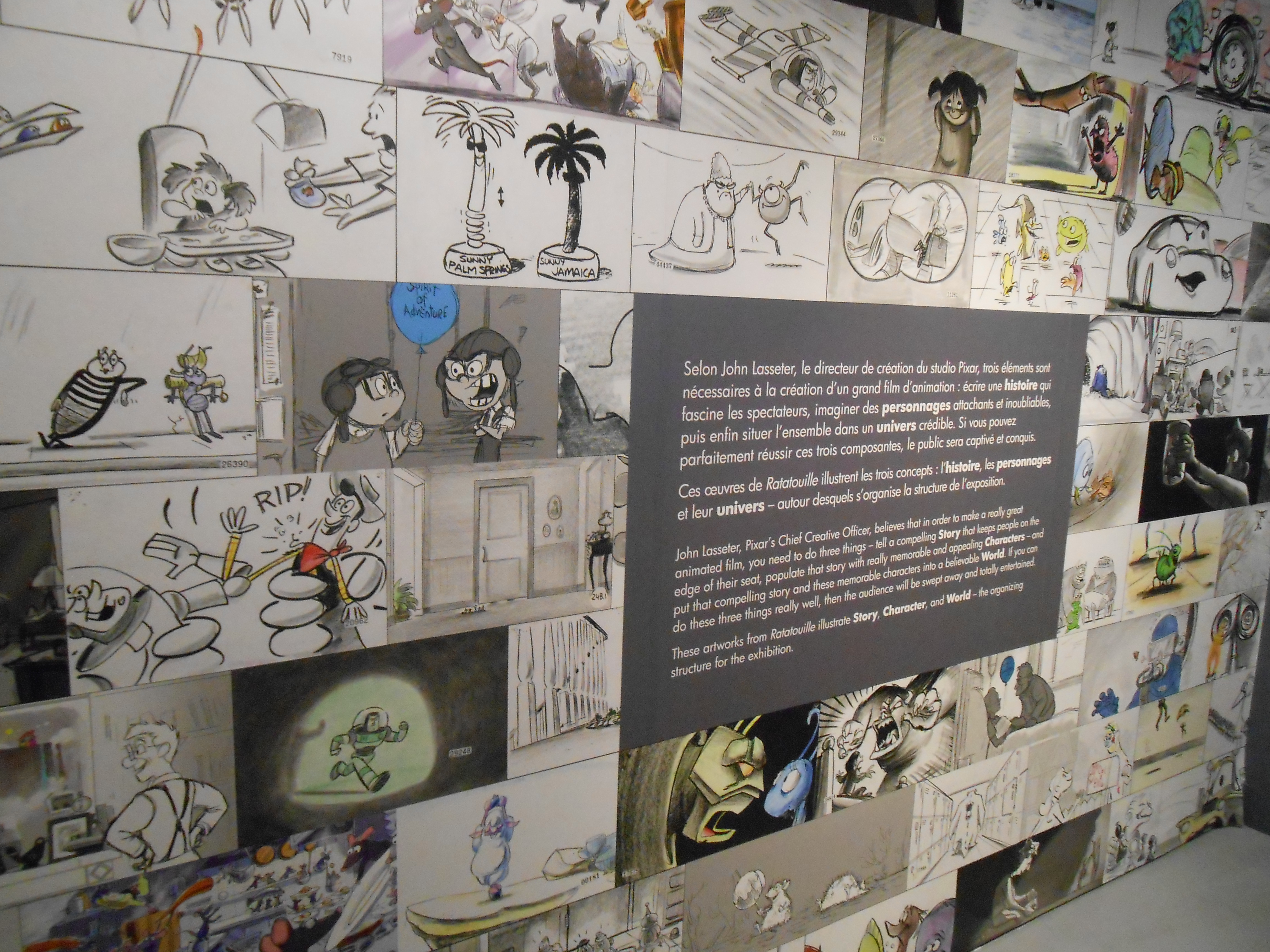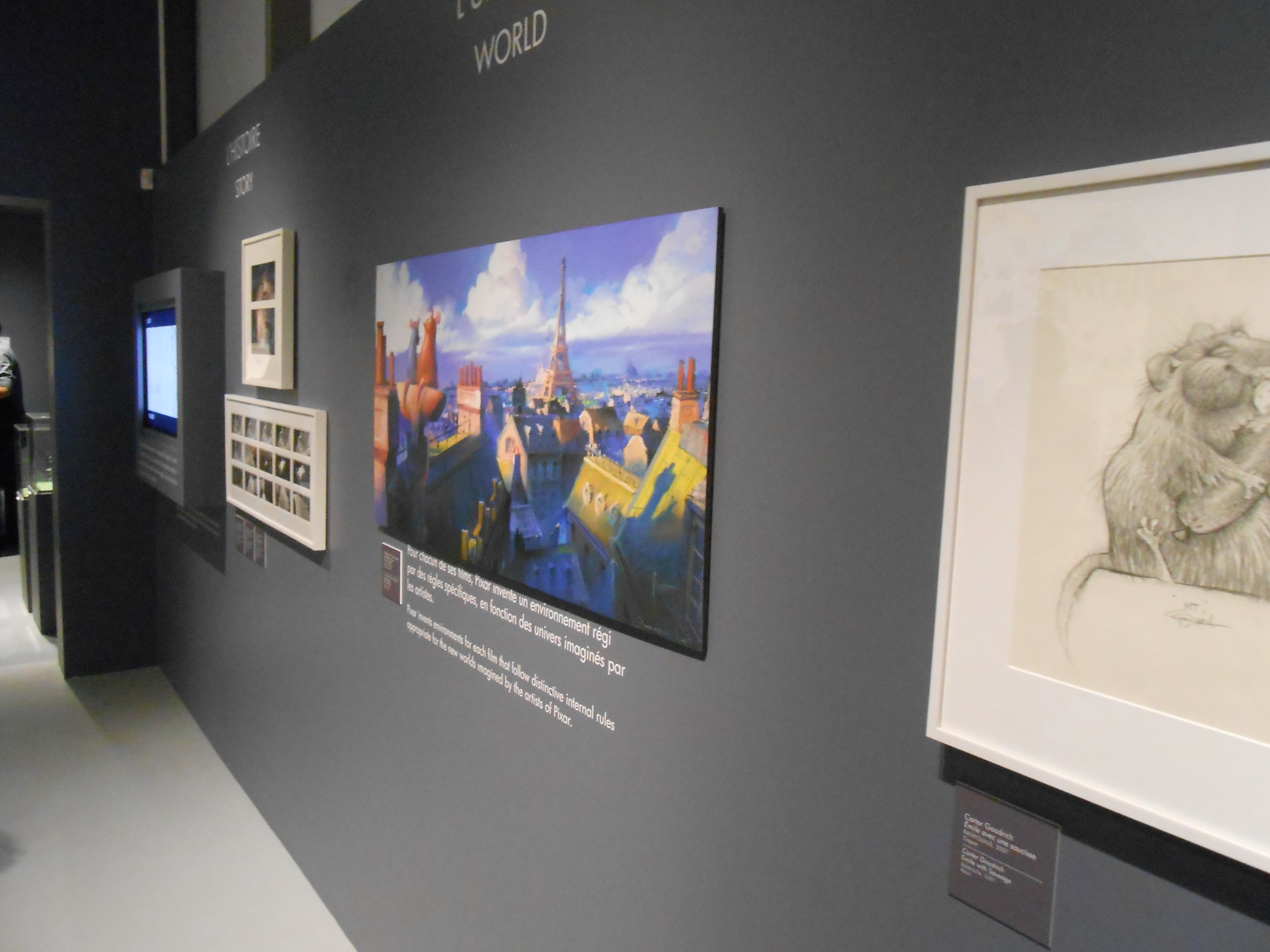 L’exposition en elle-même est très réussie. Divisée en fonction des différents films du studios, elle nous permet de profiter du talent de tous les artistes de Pixar, depuis les croquis de base, assez schématiques, en passant par des storyboards, des études de mouvements et de vraies peintures, jusqu’aux modèles 3D utilisés et scannés. Quelques vidéos et reportages d’archive viennent parsemer les lieux pour bien comprendre comment on passe de tous ces dessins grossiers au film d’animation fini.