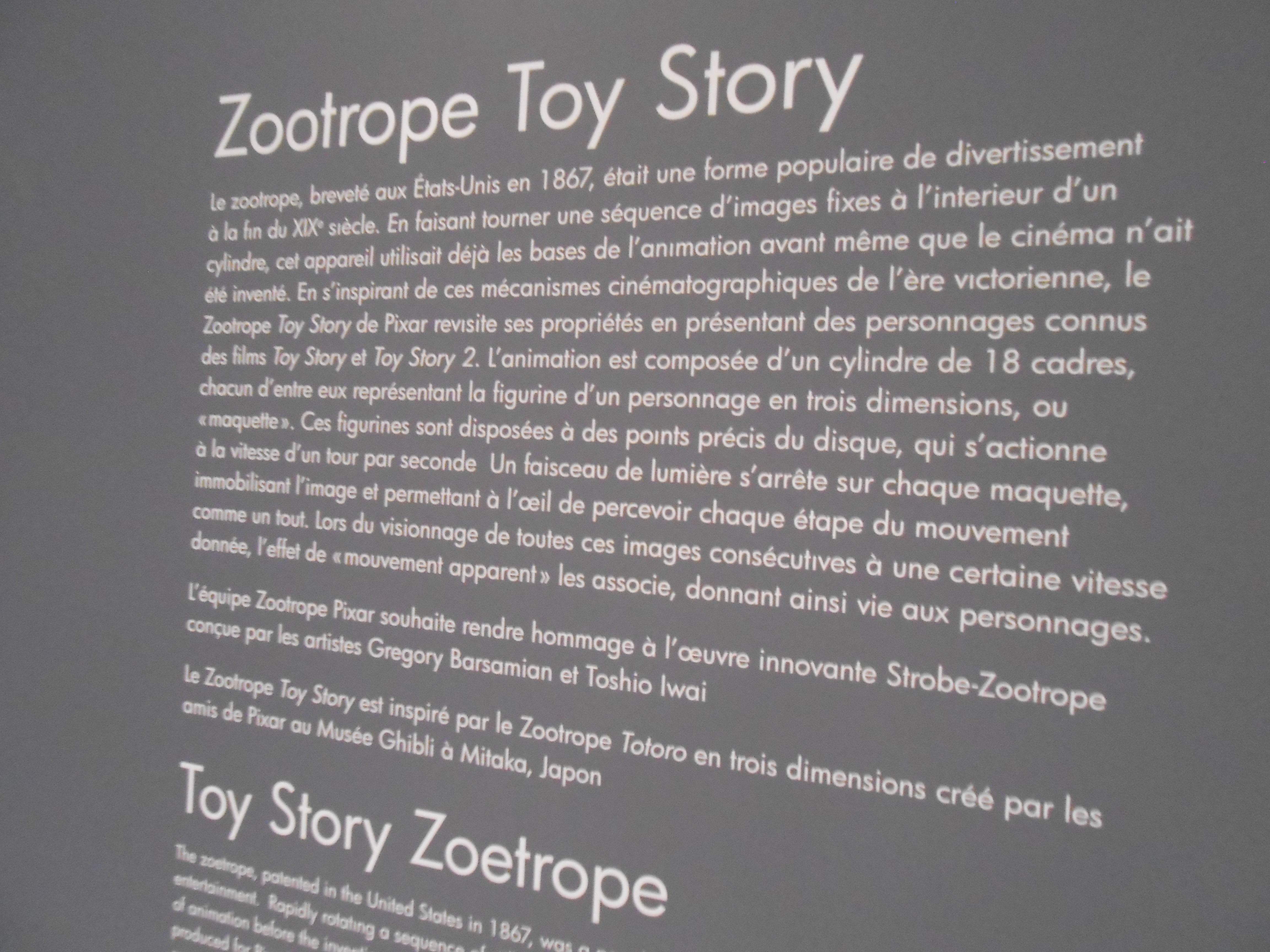 L’un des clous de cette exposition fut quand même ce Zootrope Toy Story, système mécanique d’animation inventé au XIXe siècle totalement hallucinant. Ci-après une vidéo de l’installation (désolé pour la qualité ; c’est le type de chose qu’il vaut mieux apprécier avec ses propres yeux) et l’explication en photo.