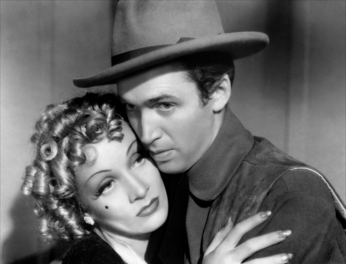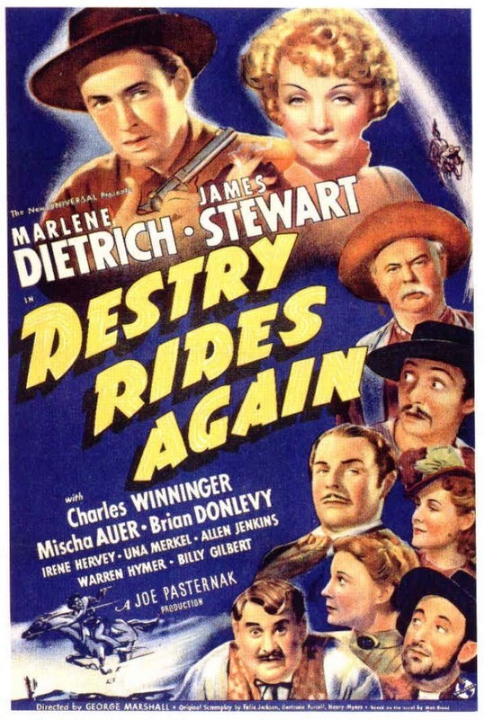 Il faut bien le reconnaitre, Marlène Dietrich joue essentiellement les utilités, plus bouclée qu’un mouton sous l’orage, moulée dans des robes d’entraineuse ou dans des costumes de cow-boy improbables plus ou moins patronne de bar, maitresse et complice du voyou spoliateur des fermiers, chanteuse à ses heures, elle tombe amoureuse du paisible Destry et lui sauve la vie avant de mourir – fort gracieusement – dans ses bras. Et si elle joue toujours excellemment de ses oeillades prometteuses elle n’est plus magnifiée par la caméra de Sternberg. Elle offre cependant une remarquable bagarre dévastatrice avec la femme d’une de ses victimes de poker qui fait date dans sa filmographie.