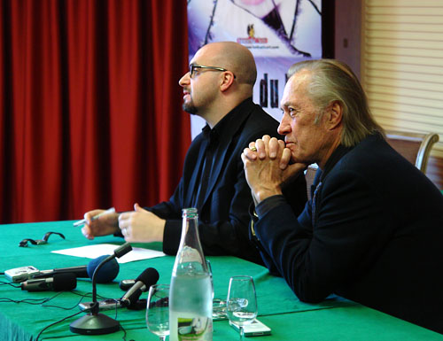Le soir même, il est censé monter sur scène pour recevoir un hommage des mains de la comédienne Julie Dreyfus, qui jouait Sophie Fatale dans Kill Bill. Nous nous retrouvons en coulisses quelques minutes avant la cérémonie; il est en smoking, mais il ne va manifestement pas bien mieux. Une amie m’ayant demandé de lui faire signer un katana, je lui tend le sabre accompagné d’un feutre et lui demande donc de bien vouloir y apposer son paraphe. Il me regarde un peu, ondule de la tête, sort le sabre de son étui, le regarde quelques secondes en se balançant doucement d’une jambe sur l’autre, et le pointe sur mon ventre, avec une pression légère mais véritable. Il ne dit rien, me regarde juste avec un petit sourire et les yeux mi-clos. Je ne sais pas trop quoi faire, j’ai un peu peur je l’avoue, et la scène dure, longtemps. Julie Dreyfus y assiste avec dans les yeux une imperceptible tension; je crois y lire « oh, la mauvaise idée ». Comme elle connaît bien l’homme, elle parvient à me communiquer son stress au moment où David Carradine finit par laisser retomber le katana. Il le signe, monte sur scène (où son ébriété ne se fera presque pas sentir), et repart dans son chalet.