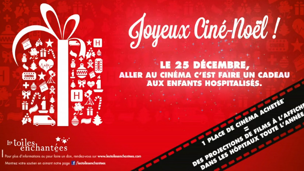 Le Ciné-Noël : une mobilisation nationale au profit des enfants hospitalisés… Le 25 décembre, aller au cinéma c’est faire un cadeau aux enfants hospitalisés ! Pour la 3ème année consécutive, l’association Les Toiles Enchantées, présidée par Alain Chabat et soutenue par de nombreux parrains du monde du cinéma, orchestre l’opération du 25 décembre.
