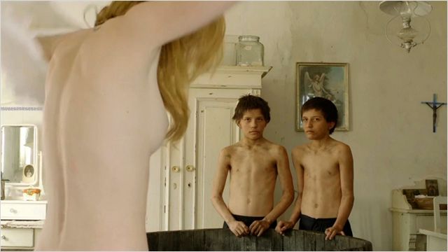 Le roman d’Agota Kristof comporte des scènes qu’on peut qualifier de scabreuses : rapport sexuel entre une jeune fille, Bec-de-lièvre, et un chien, fellation exercée par une jeune femme sur les jumeaux, scène d’ondinisme pratiquée sur un officier allemand. Aucune de ces scènes n’apparaît dans le film. Certes, la jeune fille au bec de lièvre est bien présente mais elle se contente de voler sur le marché et elle devient l’amie des jumeaux ; la jeune femme est bien en manque d’homme mais elle se contente de prendre son pied avec le … pied d’un des gamins lorsqu’elle se lave avec lui ; quant à l’officier allemand, il est bien là, lui aussi, il loge dans une dépendance, chez la grand-mère, avec un jeune soldat qui est manifestement son amant et qui est jaloux de l’attirance exercée par les jumeaux sur l’officier. Rien de plus !