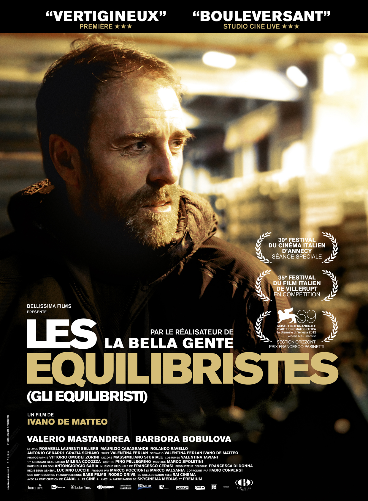 Les équilibristes est le 3ème long métrage d’Ivano De Matteo. Le premier, Ultimo Stadio, n’est jamais sorti sur nos écrans. Le 2ème, La Bella Gente Les gens bien, est sorti il y a 2 ans et il a obtenu ce qu’on qualifie habituellement de succès d’estime. A la vision de ces 2 films sortis en France, on ne peut s’empêcher de regretter qu’à chaque fois, quelques défauts dans la réalisation viennent pénaliser un sujet particulièrement intéressant : dans La Bella Gente, la peinture des contradictions que, (presque) tous autant que nous sommes, nous pouvons rencontrer entre notre compassion face à la misère des autres, qu’elle soit économique ou morale, et notre confort (petit) bourgeois, était entachée par un un certain manichéisme et un léger manque de subtilité ; dans Les équilibristes, c’est le choix d’étirer et de répéter certaines scènes dans la partie médiane du film qui ralentit son rythme et, d’une certaine façon, le banalise. Par contre, il y a un domaine d’excellence chez Ivano De Matteo : le choix des comédiens. Ici, on retiendra particulièrement Valerio Mastandrea qui joue Giulio et qui s’avère tout aussi excellent que dans le rôle du commissaire Luigi Calabresi dans Piazza Fontana. Barbora Bobulova, qui joue très finement Elena, on vient de la voir il y a 2 semaines dans Scialla ! et on l’avait remarquée il y a quelques années dans Libero. Quant à Rosabell Laurenti Sellers, qui joue Camilla, c’est une jeune comédienne de 17 ans pleine de peps et dont l’avenir s’avère très prometteur.