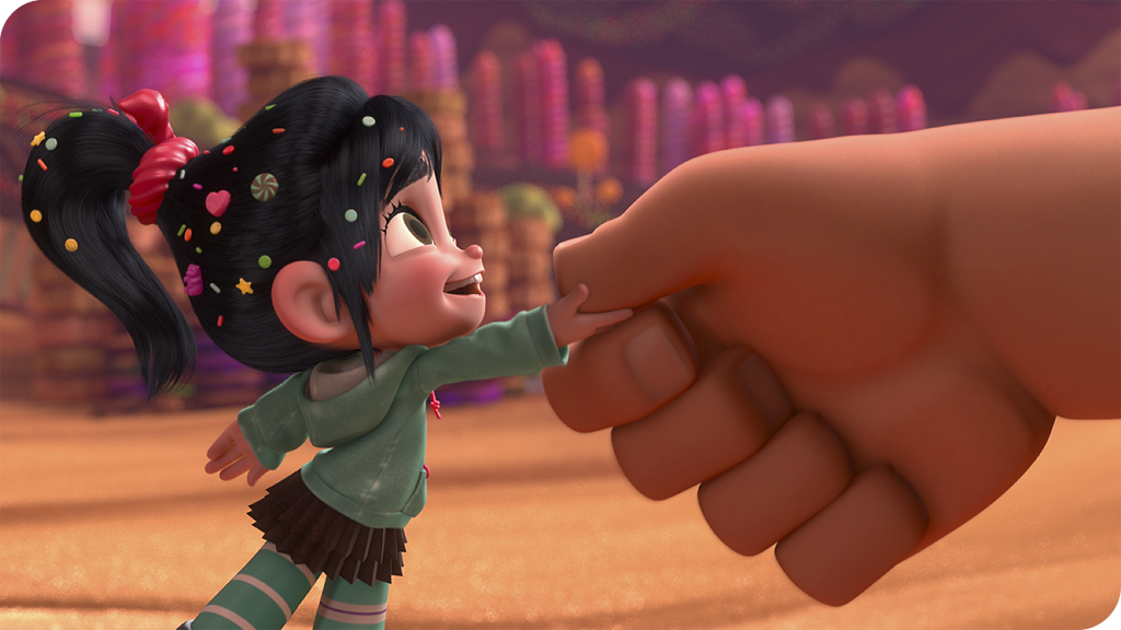 Vanellope Van Schweetz quant à elle, évolue dans un jeu de course, fabriqué uniquement de sucreries. Son gros défaut : être une erreur de programme, ce qui lui vaut d’être interdite de course et rejetée de tous…