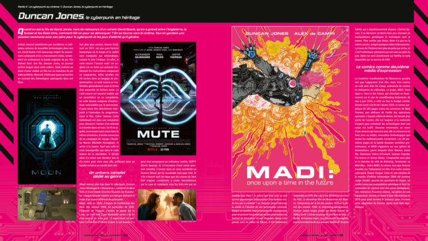 On continuera ensuite avec « Le Cyberpunk dans le jeu » (36 pages), qui nous proposera un très impressionnant retour sur les différents jeux vidéo / jeux de rôle pouvant être rattachés au genre. On y reviendra sur quelques « hits » bien connus des gamers (Deus Ex, Metal Gear Solid, Mirror’s edge et bien sûr le grandiose Cyberpunk 2077, bientôt disponible), mais également sur des jeux plus obscurs. Environ 25 jeux sont abordés dans le détail ; tous semblent d’ailleurs passionnants, et le néophyte apprendra à coup sûr l’existence de quelques trésors oubliés ou peu connus que l’on aimerait bien pouvoir essayer de nos jours. Le jeu vidéo made in France sera d’ailleurs clairement mis à l’honneur, puisqu’on trouvera également dans ces pages un entretien avec David Cage, fondateur et directeur du studio Quantic Dreams, ainsi que des entretiens avec Paul Cuisset, concepteur de jeux vidéo, ainsi qu’avec Jehanne Rousseau, cofondatrice et directrice du studio Spiders. Plus anecdotique, le dernier chapitre « La bande-son du Cyberpunk » (20 pages) reviendra sur le Cyberpunk dans la musique : bandes-originales, Billy Idol, David Bowie, Nine Inch Nails… Il ne s’agit assurément pas du chapitre le plus convaincant de Cyberpunk : Histoire(s) d’un futur imminent, mais on reconnaît aux auteurs la volonté d’avoir tenté d’être réellement exhaustifs.