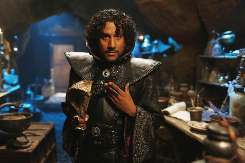 Malheureusement, les acteurs ne sauvent toujours pas la mise, même si l’ont sent une légère amélioration du côté de Emma « duckface » Rigby, qui semble presque crédible dans certaines de ses apparitions. Presque. Si la semaine passée, Naveen Andrews n’avait que peu de temps de présence à l’écran, il est cette fois-ci à l’honneur, et on aurait finalement préféré qu’il reste perdu sur l’île de Lost, tant il est ridicule dans la peau de Jafar. Ce n’est pas entièrement de sa faute, avouons-le, le comédien ayant hérité du costume le plus ridicule de l’histoire de la télévision, ainsi que de la perruque qui va avec. Difficile pour lui, dès lors, de conserver une quelconque crédibilité. De leur côté, Michael Socha et Sophie Lowe font ce qu’ils peuvent pour évoluer dans cette bouillie visuelle et scénaristique, demeurant néanmoins ce que l’épisode a de mieux à offrir. On attend avec impatience que la relation entre leurs personnages évolue, et que les flash-backs s’attardent plutôt sur le Valet que sur le transparent Cyrus.