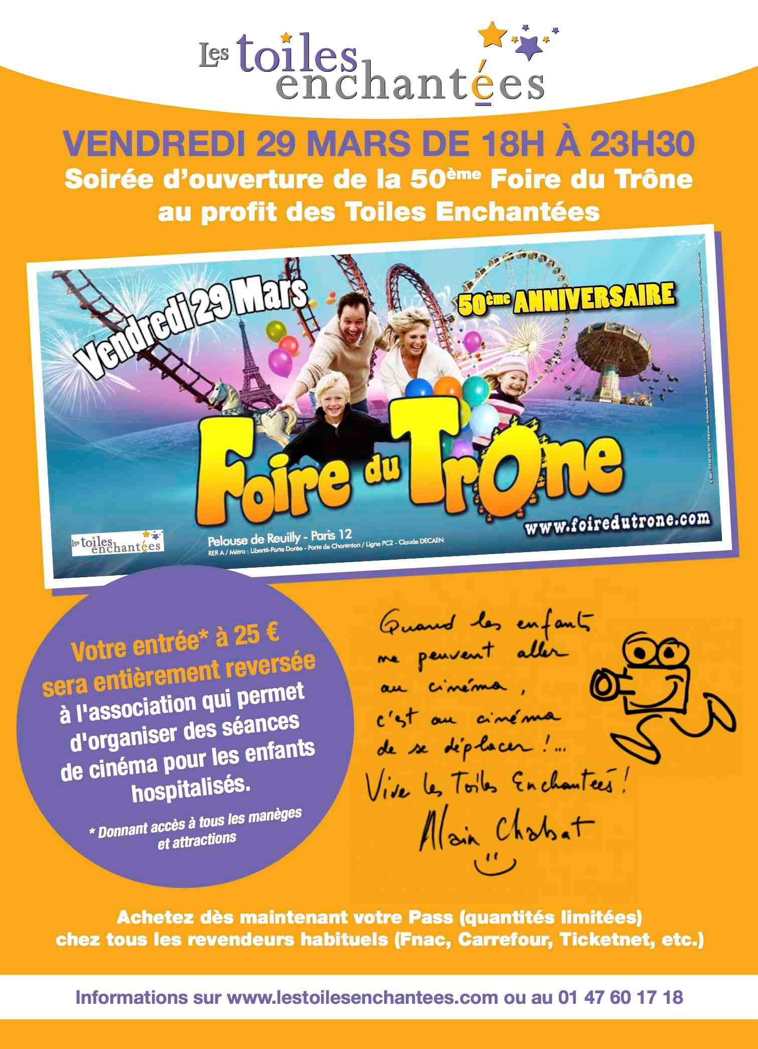 La soirée d’ouverture de La Foire du Trône, le 29 mars 2013, reversera l’intégralité des recettes à l’association Les Toiles Enchantées, présidée par Alain Chabat et soutenue par de nombreux parrains du monde du cinéma.