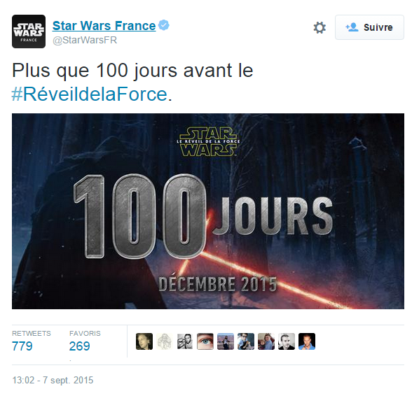 C’est le compte Twitter officiel de Star Wars France (@StarWarsFR) qui a officialisé l’information le 7 septembre en tweetant « Plus que 100 jours avant le #RéveildelaForce ». On l’attendait mondiale, la sortie de The Force Awakens sera finalement locale.