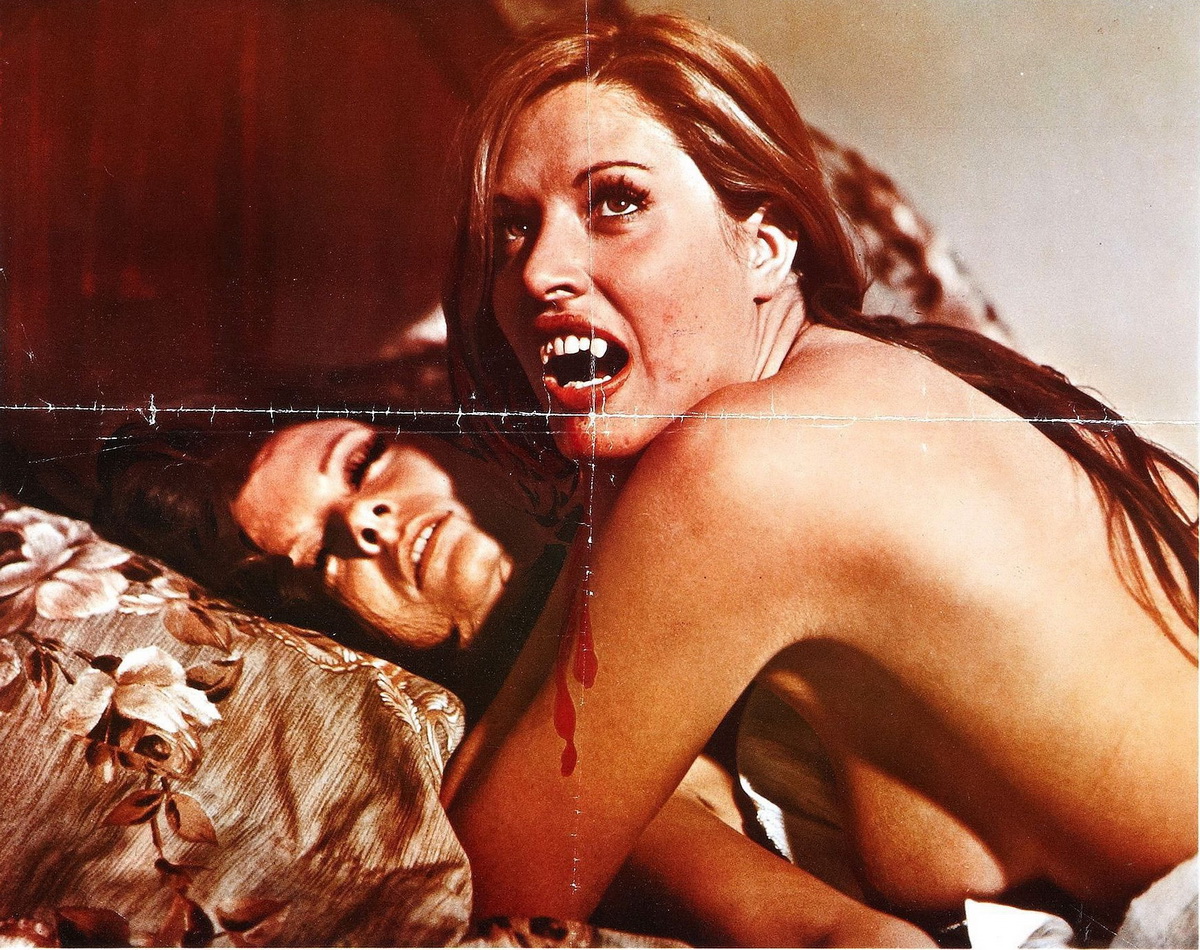 La fille de Dracula (1972) est donc un film d’horreur au cœur duquel Jess Franco fait le choix de convoquer sans vergogne les grands classiques du genre : sa variation sur le thème du vampire porte en effet exactement le même titre qu’un autre film, signé Lambert Hillyer en 1936, et qui s’avérait être la suite directe du chef d’œuvre de Tod Browning Dracula (1931). Autant dire donc que si votre grand père met le DVD ou le Blu-ray dans le lecteur en s’attendant à voir le film avec Gloria Holden, il risque d’avoir un choc à la découverte d’un film où les héroïnes ne restent jamais habillées bien longtemps… Le film met en scène un vampire, le comte Karlstein, surnommé Dracula, et incarné par Howard Vernon, complice de toujours de Jess Franco (ils ont tourné 46 films ensemble). Amoindri, affaibli, ce vampire demeure enfermé dans une crypte, incapable d’en sortir pour se nourrir. Contre toute attente, il parviendra tout de même à prendre possession de l’esprit de sa petite fille, Luisa (Britt Nichols, qui joue –tout comme Anne Libert– dans les trois films qui nous intéressent aujourd’hui, et qui tourna également avec Franco l’excellent Une vierge chez les morts vivants), la plongeant dans une sorte de frénésie (ou de transe) sexuelle, manœuvre habile quoiqu’un peu tortueuse destinée à ce que cette dernière lui ramène de jeunes filles qu’elle aura préalablement séduites, dans le but avoué de se repaitre de leur sang. Mais bien sûr, Luisa va également prendre goût au sang humain… Comme dans un roman de Gérard de Villiers (qui aimait à alterner dans sa série SAS les chapitres espionnage / érotisme / espionnage / érotisme, etc.), Jess Franco fait donc le choix d’alterner les séquences d’épouvante et les scènes érotiques, se laissant aller à filmer langoureusement ses actrices dans le plus simple appareil, et à grands renforts de zooms et de dézooms sur les zones charnues et plus ou moins poilues de leur anatomie. Et comme à son habitude, Franco lie tout cela par la musique doucement jazzy, créant une espèce de faux rythme étrange et mélancolique, à la frontière entre rêve et réalité, que l’on retrouvera dans de nombreux de ses films de l’époque, aux moments où la narration se fait de plus en plus floue, pour laisser, la plupart du temps, la place aux étreintes saphiques dans les manoirs de campagne. Mais quand on parle de vampires, quoi de plus normal que de finir au pieu ? Ah ! Ah ! (gag)