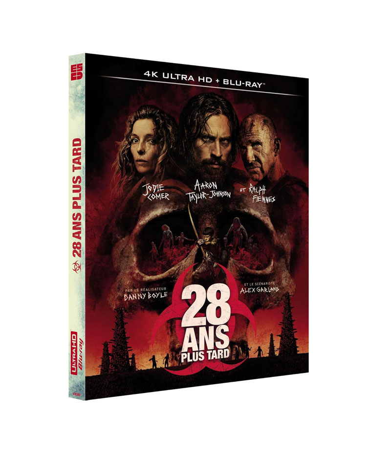 28 ans plus tard vient de sortir en France au format Blu-ray 4K Ultra HD, sous les couleurs de Sony Pictures, et la galette Katka du film nous offre une restitution visuelle à la hauteur du chaos orchestré à l’écran par Danny Boyle. Le transfert 4K, soutenu par un encodage Dolby Vision et HDR10, restitue avec précision les contrastes extrêmes du film : les scènes nocturnes sont d’une profondeur saisissante, les éclairages urbains créent des halos presque organiques, et les textures des décors (briques, sang, peau moite) gagnent en netteté sans jamais sombrer dans le lissage artificiel. Un léger grain a été conservé, ce qui renforce l’aspect brut et documentaire de certaines séquences, notamment celles tournées avec les rigs iPhone et les caméras portatives. On notera cela dit que la médaille technique a son revers : le rendu de l’ensemble est si précis que certains effets spéciaux du film en prennent déjà un petit coup de vieux. Côté son, la VO en Dolby Atmos est une réussite : spatialisation ample, effets de course immersive, et une bande-son qui alterne entre nappes anxiogènes et silences pesants. Les cris des infectés résonnent comme des alarmes internes, et les dialogues restent clairs même dans les scènes les plus agitées. La VF en DTS-HD Master Audio 5.1 s’avère également excellente, avec une dynamique solide et une bonne gestion des ambiances, même si elle manque parfois de finesse dans les transitions. Du très beau travail technique.