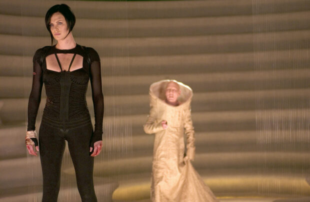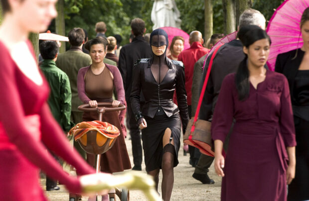 Dans Æon Flux, le futur est propre, lisse, et vaguement fasciste. La ville de Bregna ressemble à une clinique suisse sponsorisée par Apple, où les gens vivent sous la coupe d’un gouvernement scientifique qui ferait passer Elon Musk pour un hippie. Le film explore la tension entre liberté individuelle et sécurité collective, avec de gros sabots qui, de nos jours, peinent à tenir la comparaison avec un épisode de Black Mirror. Les rebelles, appelés Monicans (non, ce n’est pas une blague), communiquent par pilules télépathiques, ce qui est probablement très mauvais pour les intestins, mais possède un côté pratique. Æon Flux, en tant que personnage, incarne cette ambivalence : elle tue, elle doute, elle saute dans tous les sens (le film est un véritable festival de cabrioles), mais elle cherche aussi la vérité, comme une influenceuse en quête de spiritualité cherchant le sens de la vie entre deux placements de produits.
