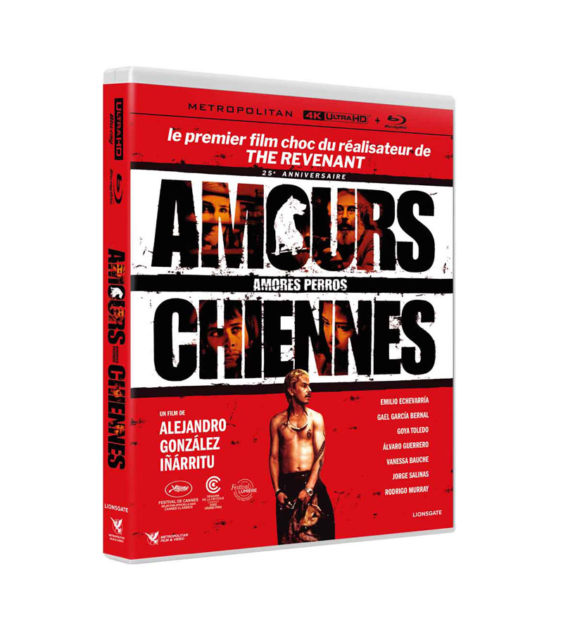 L’édition Blu-ray 4K Ultra HD d’Amours chiennes proposée par Metropolitan Film & Video est une belle réussite, d’autant plus surprenante que le transfert 4K du film nous est présenté ici en première mondiale. Cocorico ! Le packaging, sobre mais élégant, met en valeur le caractère brut du film, avec une jaquette qui évite les artifices et un boîtier qui respire le sérieux. La restauration 4K, supervisée par Alejandro González Iñárritu et son chef opérateur Rodrigo Prieto, est une réussite technique. L’image gagne en profondeur, avec un grain argentique bien présent, une définition solide et une colorimétrie nuancée. Les noirs sont plus marqués, les contrastes mieux gérés, et les scènes nocturnes retrouvent leur densité originelle. Les étalonnages HDR10 + Dolby Vision nous proposent une expérience visuelle aussi agressive qu’immersive, et donc en tous points fidèle aux intentions du réalisateur. Côté son, Amours chiennes bénéficie d’un mixage VO en DTS-HD Master Audio 5.1, dynamique et équilibré. Les voix sont claires, les ambiances urbaines bien spatialisées, et la musique de Santaolalla trouve toute sa place dans l’espace sonore. La version française, en DTS-HD Master Audio 2.0, s’avère tout à fait recommandable, même si les voix paraissent parfois un peu trop détachées du reste. Rien de rédhibitoire, mais la VO reste le choix évident pour profiter pleinement de l’atmosphère du film. Pour les cinéphiles non équipés de Home Cinema, la version originale est également disponible en DTS-HD Master Audio 2.0.
