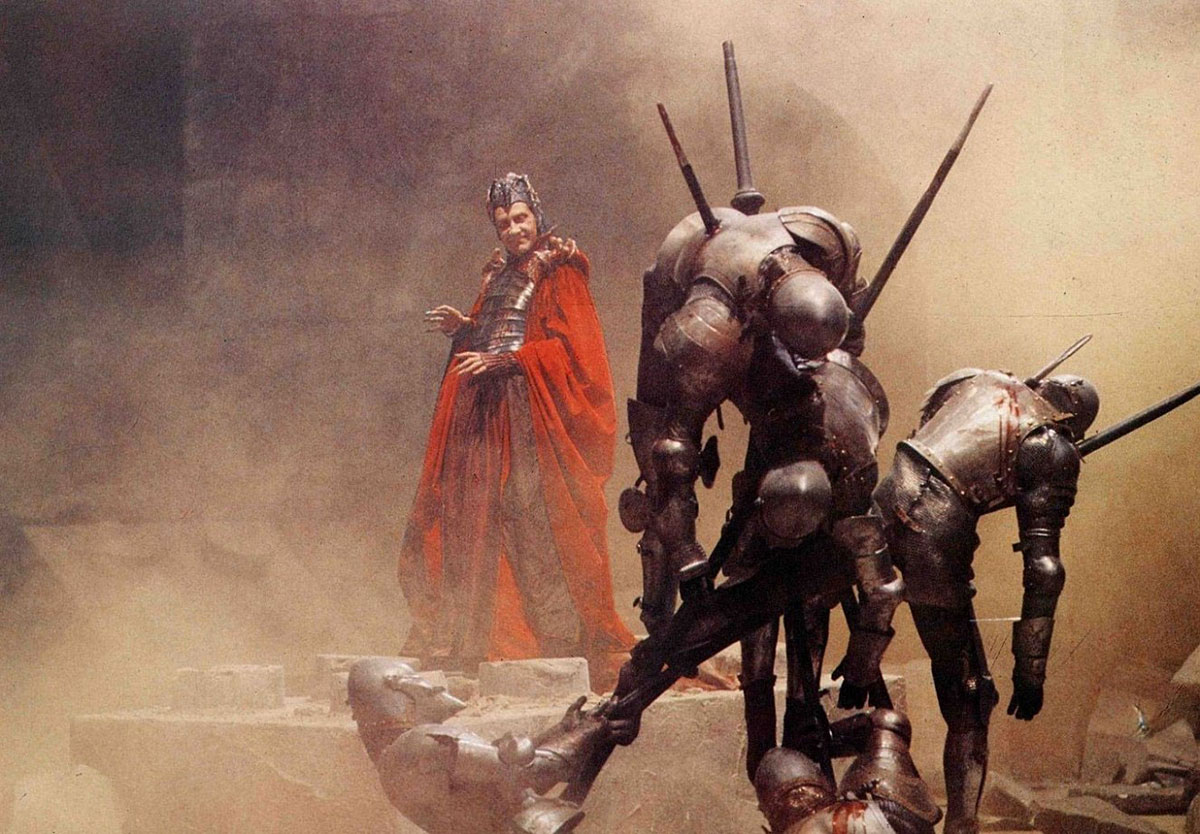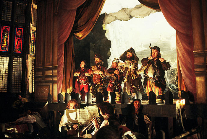 On poursuivra avec un entretien avec le co-scénariste / acteur Michael Palin (16 minutes), qui reviendra sur la question de savoir si ce film était considéré comme un film des Monty Python ou un film de Gilliam, sur le succès du film aux États-Unis, ainsi que sur le choix de David Warner pour incarner le Mal. On embrayera d’ailleurs avec un entretien avec l’acteur David Warner (9 minutes), qui sera suivi d’un entretien avec le superviseur des effets spéciaux Kent Houston (15 minutes), qui expliquera en détail comment les effets optiques du film ont été réalisés. Comme il parle sans images pour illustrer ses propos, on pourra avoir un peu de mal à le suivre. On aura également le droit à un entretien avec le chef costumier James Acheson (13 minutes), qui présentera ses croquis des tenues des personnages, les commentant en détail et évoquant son expérience sur le film, ainsi qu’à un entretien avec la chef décoratrice Milly Burns (11 minutes). Elle se remémorera sa rencontre avec Terry Gilliam et expliquera comment optimiser les décors lorsqu’on travaille avec un réalisateur comme lui, qui connaît sa vision avant même la construction des décors et la manière dont il va les filmer, pour en tirer pleinement parti.
