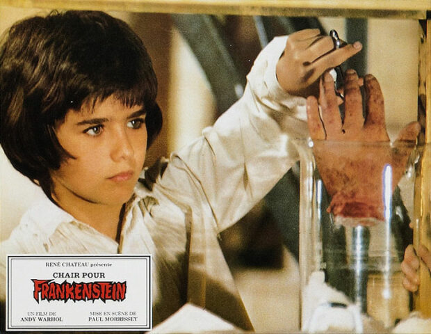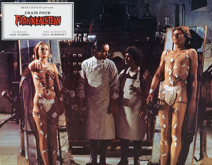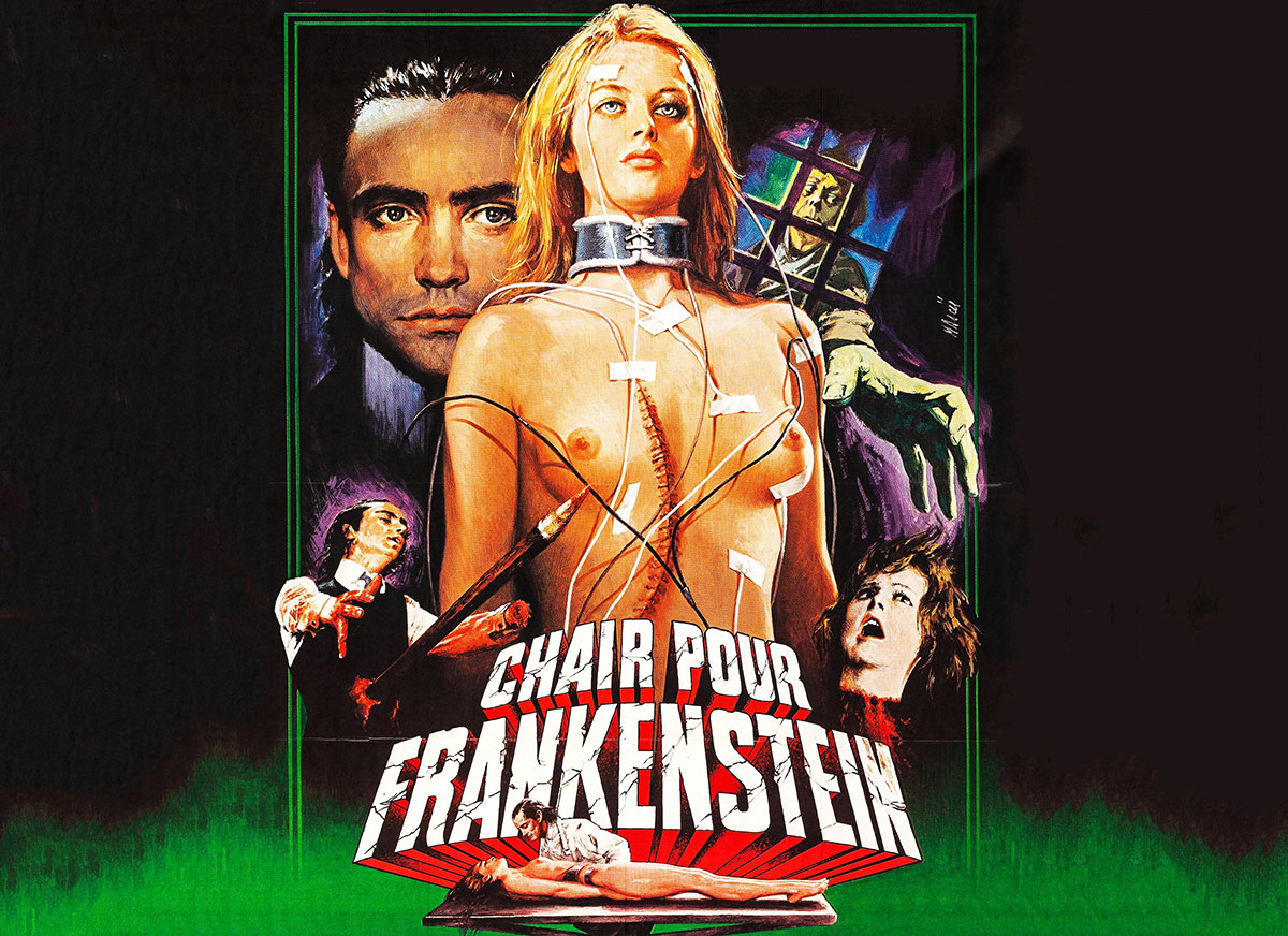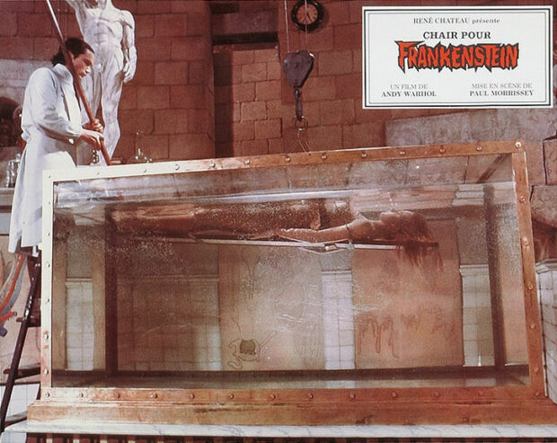 A l’époque de sa sortie dans les salles, Chair pour Frankenstein s’était distingué par l’utilisation du Space-Vision 3D, un procédé qui donne à certaines scènes une profondeur étrange, presque organique. Les plans du laboratoire, avec leurs bocaux et leurs viscères, ressemblent à des natures mortes de l’enfer. Le grain de la pellicule, parfois instable, ajoute une texture presque tactile à l’image. Et pourtant, cette esthétique crade sert parfaitement le propos : la beauté est une illusion, et la perfection un fantasme de savant fou. Les cadrages sont souvent décentrés, comme si la caméra elle-même avait peur de regarder en face ce qui se passe. Les couleurs sont saturées, presque criardes, et la musique de Claudio Gizzi ajoute une touche baroque à l’ensemble. On est loin du gothique feutré des productions Hammer : ici, tout est excessif, tout déborde. Même les dialogues, parfois absurdes, participent à cette ambiance de cauchemar éveillé…