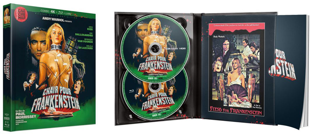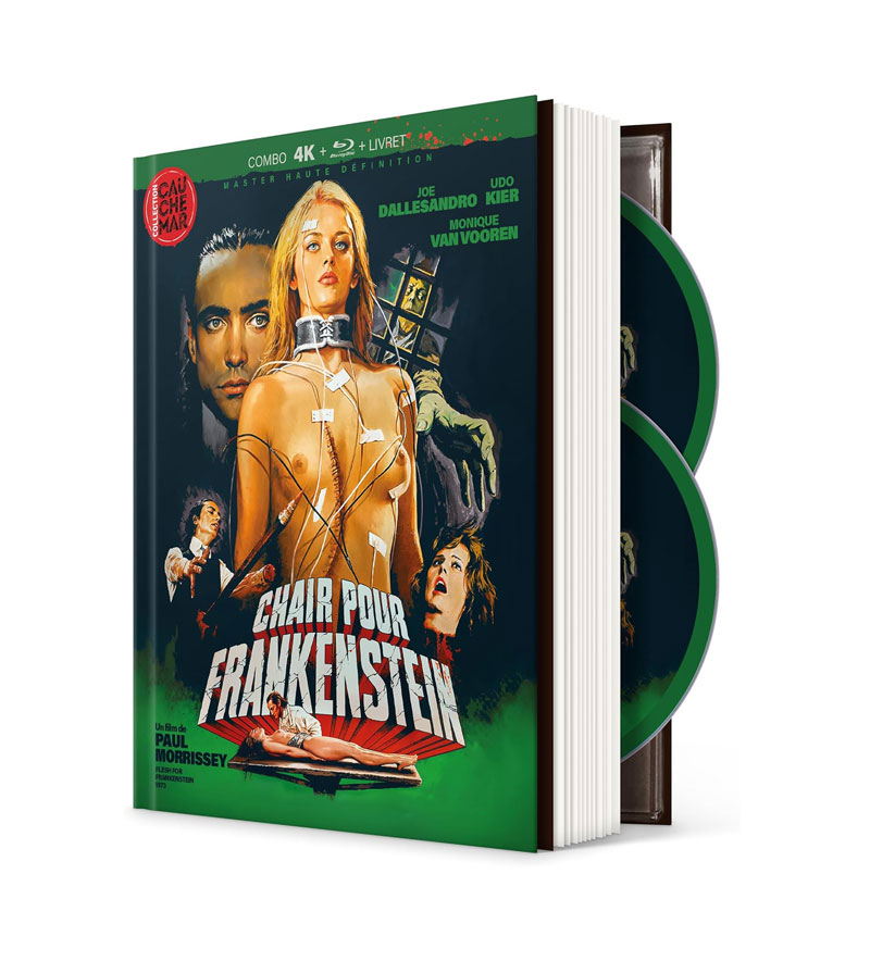 L’édition Blu-ray 4K Ultra HD de Chair pour Frankenstein proposée par Sidonis Calysta est un petit bijou pour les amateurs de cinéma bis qui chérissent leurs éditions physiques comme leurs monstres : bien emballés et un peu fêlés. Le Digibook limité, avec son livret de 52 pages signé Marc Toullec, donne déjà envie de le poser sur une étagère. Le packaging est soigné, presque luxueux, avec une iconographie qui fleure bon le latex et les fantasmes de laboratoire.