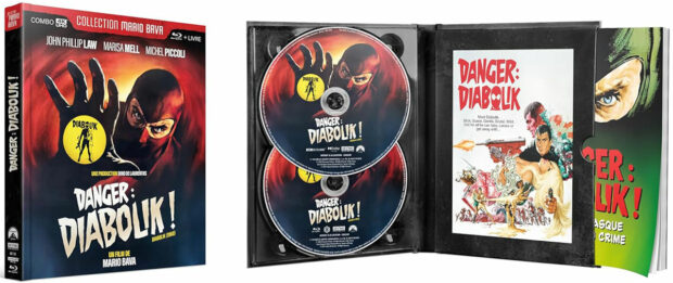 Resté totalement inédit en DVD et Blu-ray en France depuis l’avènement du format numérique, Danger Diabolik débarque finalement aujourd’hui au format Blu-ray 4K Ultra HD, sous les couleurs de Sidonis Calysta, et dans un classieux Digibook Collector qui ferait rougir un musée du design. Le boîtier, solide, élégant, accueille deux galettes et un livret de 52 pages signé Marc Toullec, que nous n’avons pas eu entre les mains mais qui s’avère probablement riche en anecdotes, analyses et documents d’époque. L’objet semble respirer le soin, la passion, et cette envie de célébrer ce film rare, devenu introuvable. Côté image, le Blu-ray 4K Ultra HD de Danger Diabolik est un choc visuel. La restauration Dolby Vision + HDR10 révèle une copie d’une beauté insolente : couleurs saturées, textures argentiques préservées, contrastes éclatants, piqué impressionnant. Les décors futuristes, les tunnels, les gadgets, les costumes : tout gagne en relief, en précision, en folie visuelle. Quelques plans plus abîmés subsistent, mais rien qui ne gâche l’expérience. Côté son, le film nous est proposé en DTS-HD Master Audio 2.0 (mono), en VO et en VF. La version originale anglaise, claire et dynamique, met en valeur les dialogues et la partition d’Ennio Morricone. La version française, doublée par des voix mythiques (Bernard Woringer, André Valmy, Jean-Claude Michel, Henri Virlojeux, et bien sûr Michel Piccoli se doublant lui-même), n’a rien d’une piste secondaire : elle est riche, vivante, parfaitement équilibrée. Les deux versions cohabitent sans hiérarchie forcée, chacune offrant une expérience cohérente et respectueuse du matériau d’origine.