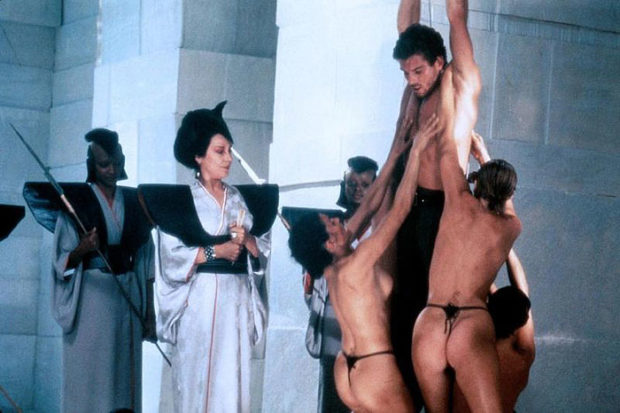 Et puisque l’on parle d’esprit BD, on ajoutera d’ailleurs qu’il est presque impossible de ne pas déceler dans Gwendoline la profonde influence qu’a pu avoir la revue de bandes dessinées Métal hurlant (1975-1987), ainsi que sa petite sœur Métal (hurlant) Aventure (1983-1985). On ne serait même pas loin d’une adaptation officielle dans l’absolu, puisque Claude Renard et François Schuiten, collaborateurs réguliers de Métal hurlant entre 1979 et 1981, se sont occupés de la conception des décors et des costumes du film. Attendez donc de voir la charge des soldats de Yik-Yak – une contrée peuplée uniquement d’amazones au crâne chauve arnachées de cuirasses de métal, et dirigée d’une main de fer par une Bernadette Lafont étonnante, se régalant d’infliger des tortures érotico-sadiques aux intrus masculins. Attendez de voir ces décors sophistiqués sublimés par la lumière superbe d’André Domage. Tellement superbe que les jeunes rappeurs toulousains BigFlo et Oli lui ont consacré une chanson il y a quelques années : « Ah c’est Domage, ah c’est Domage, c’est p’têt’ la dernière fois ». Bref, un soin tout particulier a été apporté à la conception visuelle de l’univers dans lequel nous emporte Gwendoline. Tout ça à une époque où l’on créait toute la magie à même le plateau, sans recours à d’artificiels effets numériques.