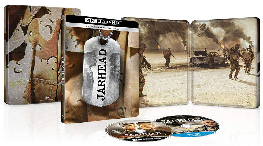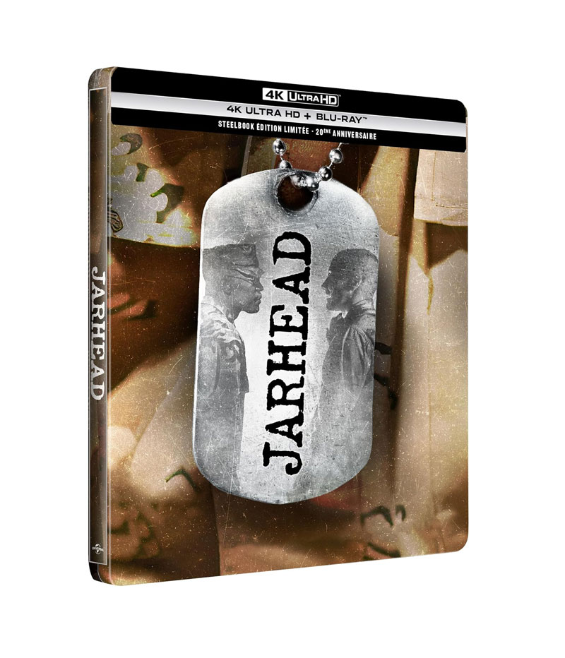 L’édition Blu-ray 4K Ultra HD de Jarhead, la fin de l’innocence, éditée par Universal Pictures, se présente dans un Steelbook élégant, qui reflète parfaitement l’austérité du film. Le visuel, minimaliste mais classieux, joue sur des teintes sable et acier, rappelant l’univers visuel de Roger Deakins. L’image, en HDR10 et Dolby Vision, est une claque silencieuse : le désert saoudien retrouve une profondeur hypnotique, chaque grain de sable devient une particule de temps suspendu. Les contrastes sont superbes, les noirs profonds, et les visages marqués par la sueur apparaissent avec une précision presque clinique. Côté son, la VO en Dolby Atmos enveloppe l’espace sonore, accentuant l’impression de solitude dans le désert, tandis que la VF en DTS 5.1 fait de son mieux, mais s’avère naturellement moins immersive. Les dialogues sont clairs, les ambiances désertiques bien restituées, même si la version originale conserve une supériorité évidente dans la spatialisation.