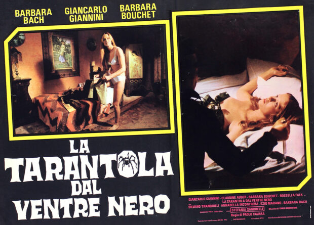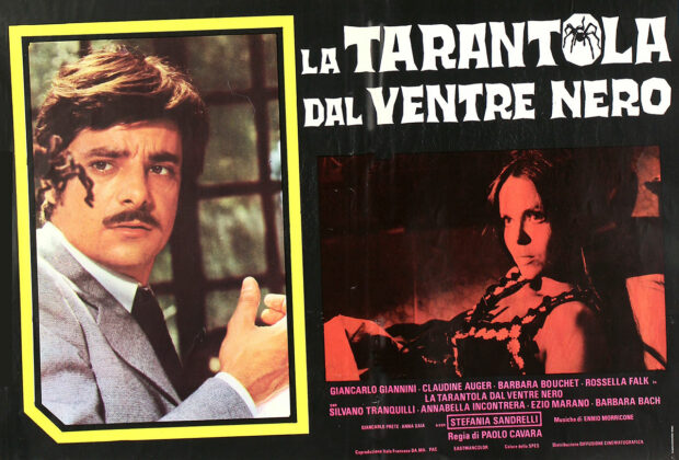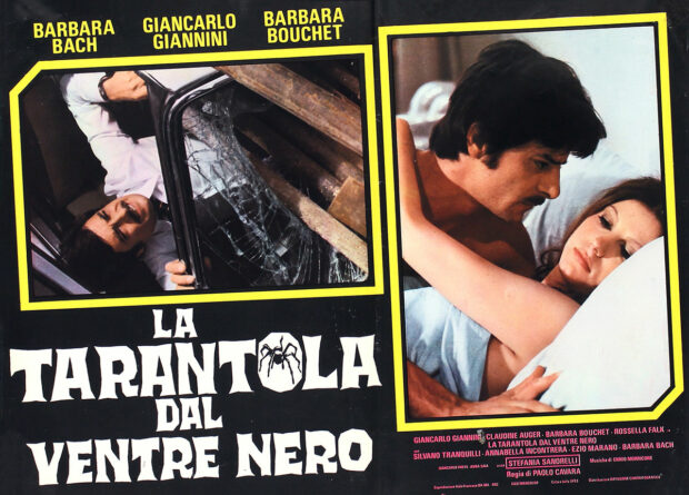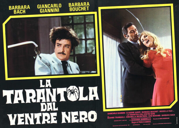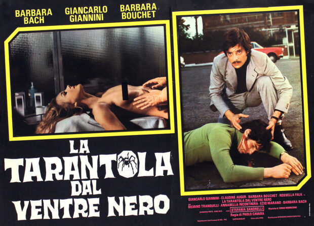 La Tarentule au ventre noir repose sur une distribution remarquable. Giancarlo Giannini, encore jeune mais déjà doté d’un regard capable de traverser un mur, incarne un inspecteur mélancolique, presque spectral. Son jeu, tout en retenue, contraste avec l’exubérance visuelle du film. Autour de lui gravitent trois actrices devenues mythiques : Barbara Bouchet (A la recherche du plaisir, La Longue nuit de l’exorcisme, Le Sourire de la Hyène…), Claudine Auger (La Baie sanglante) et Barbara Bach (Le Continent des hommes poissons, Je suis vivant). Chacune apporte une nuance différente à l’univers du film : sensualité, mystère, fragilité. Leur présence, magnifiée par les costumes et la photographie, rappelle que le giallo a souvent été un terrain d’expression pour les femmes, non pas comme simples victimes, mais comme figures complexes, ambivalentes, parfois plus dangereuses que les tueurs eux-mêmes. On soulignera d’ailleurs tout particulièrement la présence de Barbara Bouchet, véritable icône du Bis qui a joué dans tellement de séries B qu’on aurait du mal à toutes les citer ; tout juste pourra-t-on remarquer que si elle a navigué dans la plupart des genres en vogue dans les années 60/70 (giallo, comédie sexy, espionnage, polar…), elle n’a jamais tourné de péplum, au grand dam de ses admirateurs de l’époque, qui scandaient à l’entrée de tous les cinémas de quartier « Bouchet ! A l’arène ! Bouchet ! A l’arène ! ». On murmure également que l’humoriste Manu Levy, grand admirateur de l’actrice, aurait tenté il y a quelques années de monter un spectacle de stand-up avec Barbara Bouchet, mais que les producteurs n’ont pas suivi, arguant qu’un spectacle intitulé « Levy et Bouchet » n’attirerait que des plombiers. Dommage !