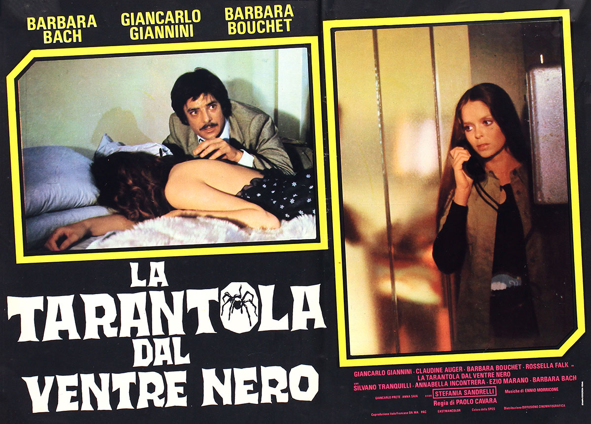 La Tarentule au ventre noir repose sur une distribution remarquable. Giancarlo Giannini, encore jeune mais déjà doté d’un regard capable de traverser un mur, incarne un inspecteur mélancolique, presque spectral. Son jeu, tout en retenue, contraste avec l’exubérance visuelle du film. Autour de lui gravitent trois actrices devenues mythiques : Barbara Bouchet (A la recherche du plaisir, La Longue nuit de l’exorcisme, Le Sourire de la Hyène…), Claudine Auger (La Baie sanglante) et Barbara Bach (Le Continent des hommes poissons, Je suis vivant). Chacune apporte une nuance différente à l’univers du film : sensualité, mystère, fragilité. Leur présence, magnifiée par les costumes et la photographie, rappelle que le giallo a souvent été un terrain d’expression pour les femmes, non pas comme simples victimes, mais comme figures complexes, ambivalentes, parfois plus dangereuses que les tueurs eux-mêmes. On soulignera d’ailleurs tout particulièrement la présence de Barbara Bouchet, véritable icône du Bis qui a joué dans tellement de séries B qu’on aurait du mal à toutes les citer ; tout juste pourra-t-on remarquer que si elle a navigué dans la plupart des genres en vogue dans les années 60/70 (giallo, comédie sexy, espionnage, polar…), elle n’a jamais tourné de péplum, au grand dam de ses admirateurs de l’époque, qui scandaient à l’entrée de tous les cinémas de quartier « Bouchet ! A l’arène ! Bouchet ! A l’arène ! ». On murmure également que l’humoriste Manu Levy, grand admirateur de l’actrice, aurait tenté il y a quelques années de monter un spectacle de stand-up avec Barbara Bouchet, mais que les producteurs n’ont pas suivi, arguant qu’un spectacle intitulé « Levy et Bouchet » n’attirerait que des plombiers. Dommage !