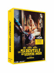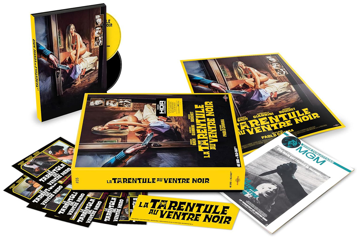 Le Blu-ray 4K Ultra HD de La Tarentule au ventre noir, édité par Carlotta Films, constitue le 35ème coffret de la collection « Édition Prestige Limitée » de l’éditeur, et on admettra sans peine que cette édition – uniquement tirée à 2000 exemplaires – mérite pleinement ce qualificatif de prestige. Le packaging, véritable objet de collection, adopte un format boîte cloche d’une élégance rare. Le design est soigné, et l’ensemble respire le soin et la passion : un digipack exclusif accueille le Blu-ray et le disque 4K Ultra HD (Dolby Vision et HDR10), tandis que divers éléments de memorabilia complètent l’expérience. Le fac-similé du guide publicitaire d’époque, six lobby cards au format généreux, un autocollant du titre français et une affiche (38,2 x 53,5 cm) reproduite avec fidélité transforment cette édition en petit musée portatif. Carlotta Films démontre une fois de plus son savoir-faire dans la valorisation du patrimoine, offrant un écrin à la hauteur du film.