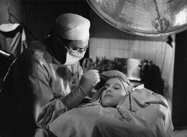 Le challenge, pour les humbles aspirants-critiques que nous sommes, est ainsi de tenter d’aborder le « monument » que représente Les Yeux sans visage en faisant abstraction des analyses pertinentes et parfois exhaustives que nous ont livré les plus fines plumes françaises et internationales ces soixante-cinq dernières années. Il faut savoir par ailleurs qu’il est formellement interdit par le Syndicat de la Critique de rédiger une critique négative du film de Franju ; les systèmes de notation sont automatiquement bloqués au maximum quand il s’agit de ce film, et en cas de rédaction de propos ne serait-ce qu’un peu mitigés sur Les Yeux sans visage, votre ordinateur explose (ou votre maison brûle si vous rédigez sur papier). C’est marrant d’ailleurs, parce que c’est un peu pareil avec Johnny s’en va-t-en guerre que l’on évoquait dans nos colonnes pas plus tard qu’hier.