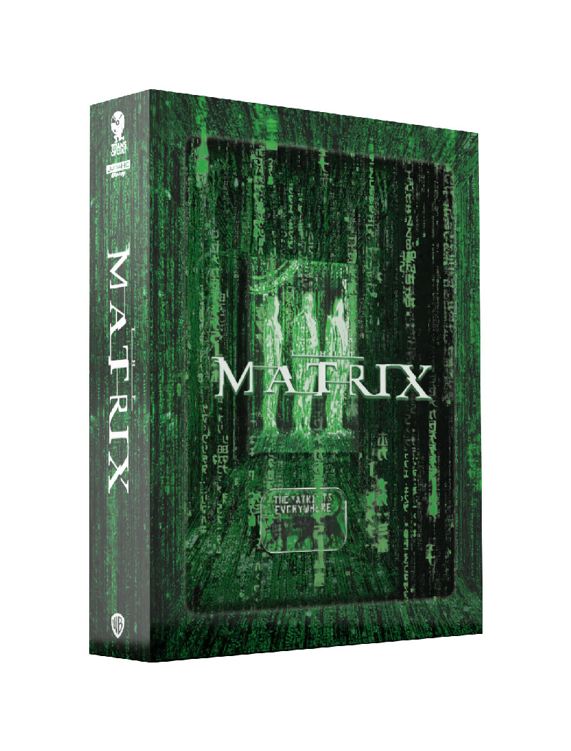 Matrix vient donc de débarquer au format Blu-ray 4K Ultra HD dans la collection « Titans of Cult » de Warner Bros. : en plus du film en 4K et Blu-ray (+ un Blu-ray de bonus), qui sont présentés dans un magnifique Steelbook inédit, le superbe coffret que nous a concocté l’éditeur contient également un pin’s en résine « The Matrix is everywhere » ainsi qu’un Magnet des agents de la Matrice. Le tout est présenté dans un grand boîtier semi-transparent aux couleurs du film, et s’avère du meilleur effet : un superbe objet de collection. Concernant le transfert 4K disponible sur la galette, le film des Wachowski a bénéficié d’un nouveau scan 4K supervisé par Bill Pope, le directeur photo du film.