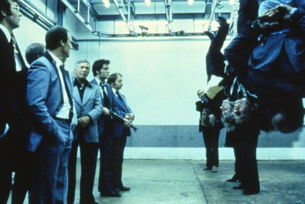 La bande-son de Francis Monkman dans Racket mérite une mention particulière. Elle oscille entre pulsations électroniques et envolées orchestrales, comme si Kraftwerk avait décidé de se mettre au service d’un opéra mafieux. Cette musique crée un décalage qui accentue la tension dramatique : les explosions ne sont pas seulement visuelles, elles résonnent dans les oreilles comme des alarmes intérieures. On retrouve ici une logique qui rappelle certains films américains tournés à peu près à la même époque, comme Scarface ou Serpico, où la musique devient un personnage à part entière. Dans Racket, elle souligne davantage la modernité du propos : la criminalité n’est plus une affaire de ruelles sombres, mais de deals financiers, de spéculations immobilières, de flux invisibles. La musique traduit cette invisibilité en sons qui semblent surgir d’un futur incertain.