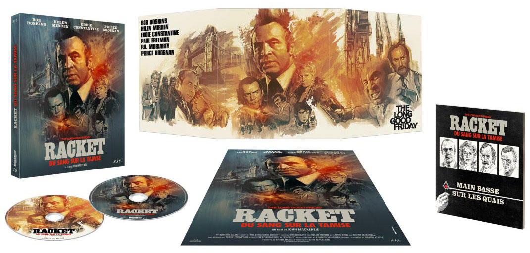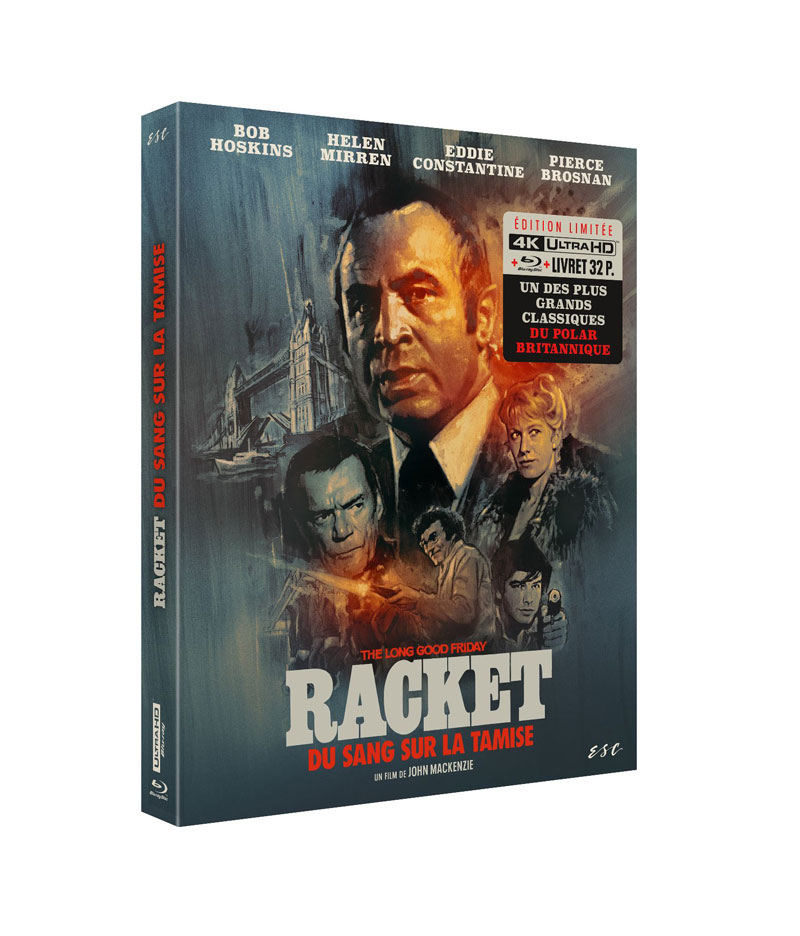 Les amoureux du film pourront ensuite se plonger dans le commentaire audio de John Mackenzie, qui nous déroulera une véritable masterclass improvisée : il raconte les huit versions successives du scénario, les improvisations de Bob Hoskins, les choix de mise en scène parfois dictés par les contraintes budgétaires, et les tensions avec la production. Ce commentaire est d’autant plus précieux qu’il ne se contente pas d’anecdotes croustillantes : il offre une réflexion sur la manière dont un film se construit, se déconstruit et se reconstruit au fil des drafts et du montage. Anecdote amusante : John Mackenzie nous avouera fermer les yeux lors des scènes les plus violentes du film – une preuve que la brutalité du film n’était pas une simple posture esthétique mais une expérience éprouvante, même pour son créateur. On terminera enfin avec un passionnant making of rétrospectif (55 minutes). Réalisé en 2006, il rassemble les témoignages de John Mackenzie, Barry Hanson, Barrie Keeffe, Phil Méheux, Bob Hoskins, Helen Mirren et même Pierce Brosnan. On y découvre des détails savoureux : la manière dont la scène de la voiture piégée a été tournée, les débats sur la représentation de Victoria (qui devait initialement être un personnage secondaire sans épaisseur), ou encore les difficultés de post-production qui faillirent enterrer le film. Ce documentaire est une pièce maîtresse, car il ne se limite pas à l’histoire officielle : il montre aussi les contradictions, les tensions et les hasards qui ont façonné Racket (Du Sang sur la Tamise). On notera par ailleurs la présence dans le coffret Blu-ray 4K Ultra HD du film d’un livret de 32 pages et une reproduction de l’affiche du film signée Tony Stella. Un grand bravo à ESC Films, qui nous livre ici une édition qui conjugue exigence technique et richesse éditoriale, et qui transforme le visionnage en expérience totale.