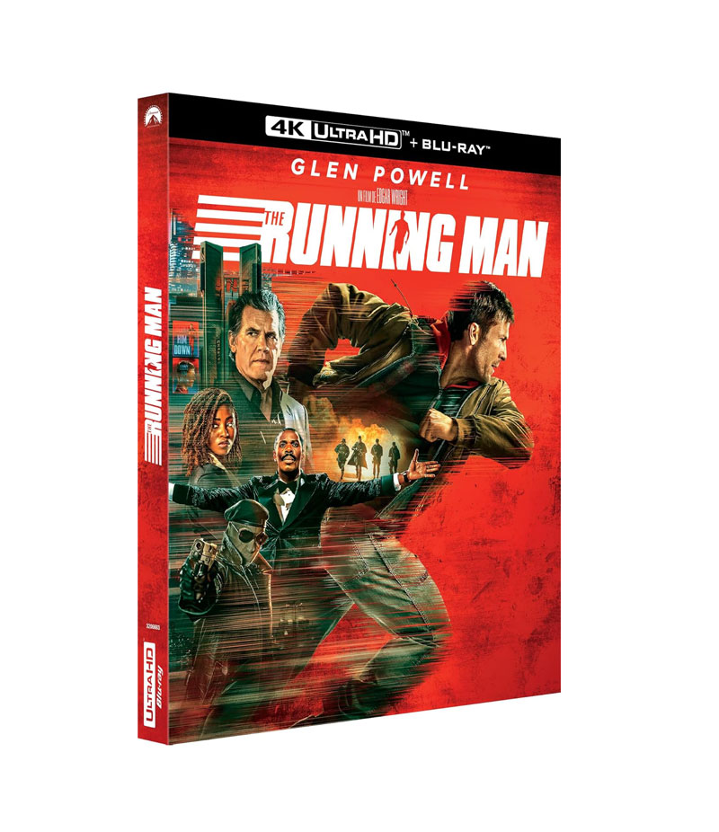 A une époque où les sections « bonus » des Blu-ray et 4K UHD se réduisent comme des peaux de chagrin, les suppléments du Blu-ray 4K Ultra HD de Running Man nous apparaissent comme d’une générosité presque indécente. Le disque 4K Ultra HD accueille le commentaire audio d’Edgar Wright, Glen Powell et Michael Bacall (VOST), un trio qui revient sur l’adaptation du roman de Stephen King, les choix narratifs, les scènes abandonnées, les contraintes de tournage et les ajustements permanents entre storyboard et réalité du plateau. Le commentaire est dense, vivant, parfois hilarant, et offre un éclairage passionnant sur la manière dont Edgar Wright a voulu réinventer le matériau d’origine. On poursuivra ensuite avec une avalanche de modules. On commencera avec un court making of (12 minutes), qui revient sur la genèse du projet, l’arrivée de Wright, et la volonté de revenir à l’esprit du roman. La featurette suivante reviendra sur les personnages et le casting (17 minutes), et la manière dont chacun a abordé son rôle dans cet univers dystopique. Le module suivant reviendra sur l’univers du film (17 minutes), et dévoilera les secrets du Production Design, entre futurisme sale, architecture oppressante et gadgets technologiques absurdes. Enfin, la featurette consacrée au tournage du film (29 minutes) nous plongera dans la mise en scène d’Edgar Wright, son découpage, son travail sur le rythme et la chorégraphie des poursuites.