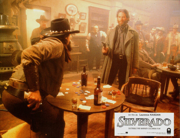 Mais Silverado ne se contente pas de faire du neuf avec du vieux. Il injecte dans ses veines poussiéreuses une énergie presque punk, portée par un casting qui s’amuse visiblement beaucoup. Kevin Kline, en cow-boy élégant et désabusé, semble tout droit sorti d’un western existentialiste. A l’inverse, Kevin Costner, lui, bondit partout comme un chiot sous amphétamines, dans un rôle de frangin tête brûlée en mode Speedy Gonzalez. Danny Glover, en tireur d’élite au cœur gros comme un bison, apporte une touche politique bienvenue, sans jamais tomber dans le prêchi-prêcha. Silverado, c’est aussi ça : un film qui parle de racisme, de justice et de rédemption, mais sans avoir l’air d’y toucher. C’est aussi un film sur l’amitié virile, celle qui se construit à coups de fusil, de regards entendus et de bières tièdes. Les quatre héros, chacun avec son passé cabossé, forment une sorte de boys band du Far West, version pré-Spotify. Et si l’on devait chercher une morale à Silverado, ce serait peut-être celle-ci : dans un monde où les lois sont faites par les plus forts, il faut parfois sortir son colt pour faire respecter la justice. Ou au moins pour se faire respecter au saloon. Ce n’est pas très woke, certes, mais c’est diablement efficace. Et puis, entre deux fusillades, il y a toujours un moment pour une petite réflexion sur la fraternité, la loyauté, et la difficulté de rester droit dans un monde qui penche comme une table de camping installée dans un terrain vague.