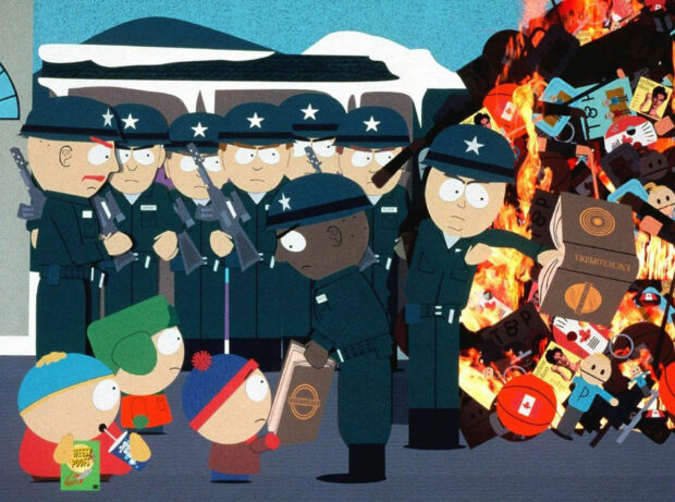 N’en déplaise à ses détracteurs, South Park, le film est aussi la preuve que l’irrévérence peut être un Art, et que le mauvais goût, quand il est bien dosé, peut devenir une arme de critique massive. Remettons un peu le film dans son contexte de production : sorti en 1999, il s’inscrit dans une époque où l’animation pour adultes commence peu à peu à sortir de sa niche. Mais là où la plupart de ses contemporains jouent encore la carte du malaise ou de la satire molle, South Park, le film fonce dans le tas, cherchant à choquer, à provoquer, à faire rire jaune. Et il y arrive, avec une efficacité redoutable. La structure narrative du film repose sur un schéma classique : des enfants découvrent un film interdit, deviennent vulgaires, et déclenchent une guerre entre les États-Unis et le Canada. Et ça a beau être con, on ne peut pas louper la parabole sur la censure, sur l’hypocrisie parentale, et sur la peur de l’influence culturelle.