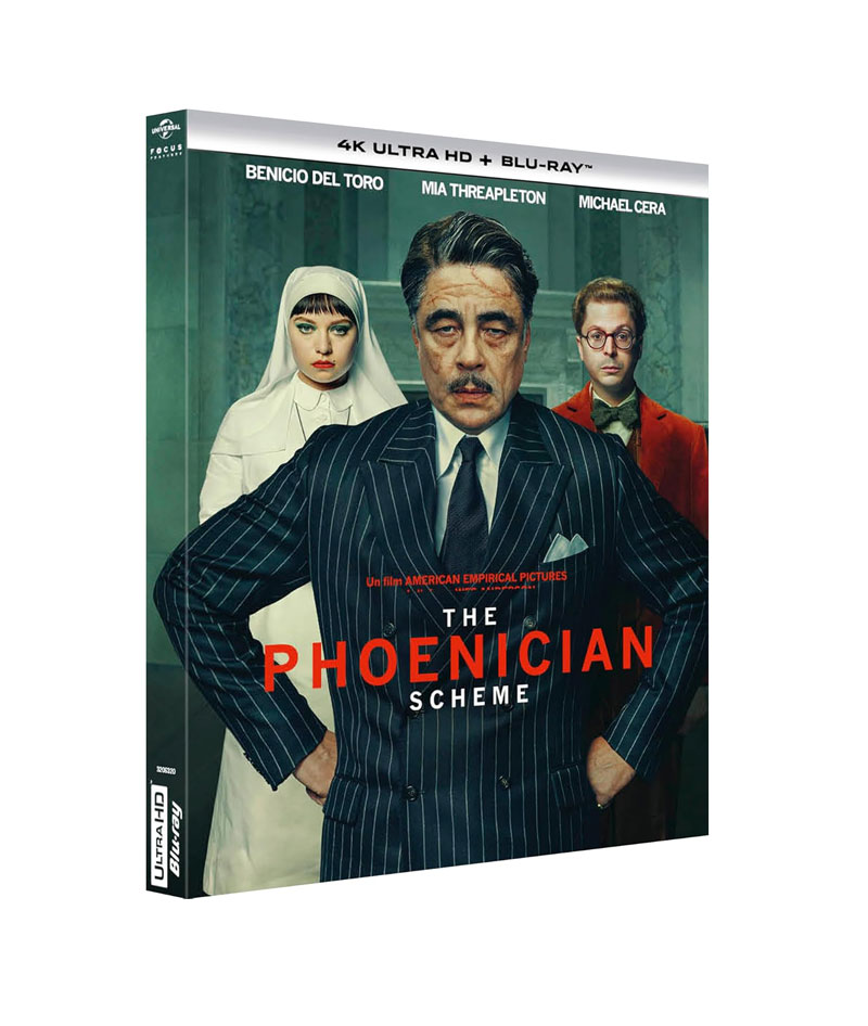 Disponible depuis quelques jours sous les couleurs de Universal Pictures, l’édition Blu-ray 4K Ultra HD de The Phoenician Scheme est à l’image du film : soignée, stylisée, et un brin excessive. Le transfert 4K restitue avec brio la direction artistique millimétrée de Wes Anderson. Grâce à l’étalonnage qui nous est à la fois proposé en Dolby Vision et HDR10, les couleurs explosent sans jamais saturer : les rouges sont profonds, les bleus glacés, et les dorures du club marseillais brillent comme un string en latex sous projecteur. Le grain pellicule est conservé, offrant une texture organique qui évite le piège du lissage numérique. Les contrastes sont maîtrisés, les détails des décors (boiseries, tapisseries, avions miniatures) ressortent avec une netteté bienvenue. Côté son, la VO en Dolby Atmos nous offre une spatialisation ample et immersive, avec une belle gestion des ambiances feutrées et des effets discrets. Les dialogues sont clairs, la musique d’Alexandre Desplat bien intégrée, et les scènes d’action aérienne bénéficient d’un relief sonore convaincant. De son côté, la VF en Dolby Digital 5.1 s’en sort honorablement, même si elle manque un peu de finesse dans les transitions et d’impact dans les basses. On privilégiera donc naturellement la version originale, plus dynamique et mieux équilibrée.