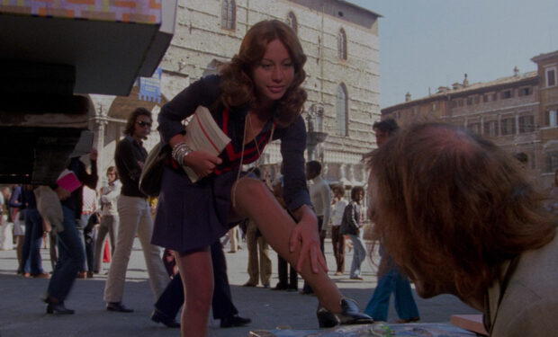 Le contexte de Torso est essentiel pour comprendre sa tonalité. L’Italie de 1973 est un pays traversé par les contradictions : libération sexuelle, mouvements étudiants, violence politique, modernité qui s’invite dans les rues mais pas encore dans les mentalités. La mode de l’époque, notamment féminine – mini-robes, décolletés plongeants, foulards, pantalons taille haute – telle qu’on la découvre dans le film raconte une jeunesse qui veut respirer, s’affirmer, exister. Torso capte cette énergie, mais la retourne contre ses personnages : la liberté attire le danger, la sensualité devient vulnérabilité, et les espaces ouverts se transforment en pièges. Sergio Martino filme Pérouse comme une ville où la modernité se heurte à des ombres anciennes, et l’un de ses plus grands plaisirs est de jouer avec les espaces. Les premières scènes, urbaines, sont filmées comme des labyrinthes : escaliers, couloirs, salles de cours, rues étroites. Puis le film se déplace vers une villa isolée, perchée sur les hauteurs, où l’air semble plus pur mais où la menace devient plus dense – un décor qui se referme lentement sur les personnages. Torso utilise l’espace comme une arme, et c’est en partie cette maîtrise du cadre qui donne au film sa puissance.