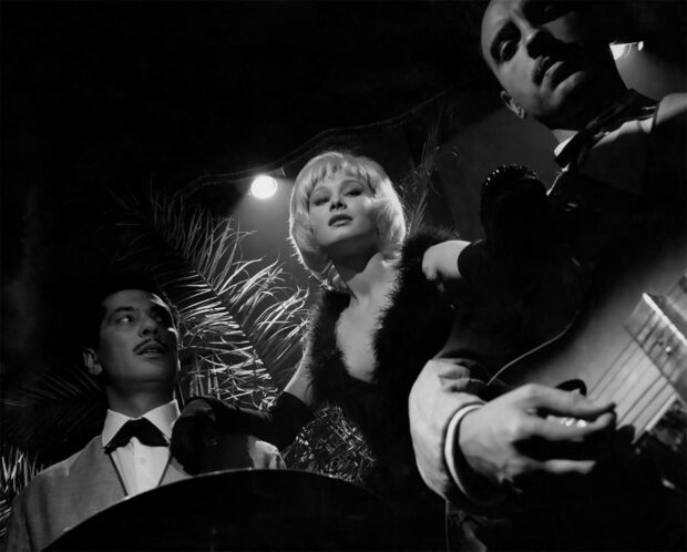 Car malgré son titre français opportuniste fleurant bon l’Euro Spy, Agent 077 – Opération Sexy est bel et bien un pur Film Noir. De plus, avec le recul, le fait qu’Orson Welles ait choisi Jess Franco comme assistant réalisateur sur le tournage de Falstaff en 1965 tend à créer des passerelles mentales entre les Films Noirs tournés par le cinéaste espagnol et le grand classique du genre mis en scène par Orson Welles, La Dame de Shanghaï (1947). Ainsi, le costume du personnage central ressemble étrangement à celui du personnage que Welles interprétait dans le film. D’un point de vue formel, on notera la même utilisation intensive des miroirs, et l’intrigue du film de Franco implique également tout un réseau de tromperies et de jeux de dupes impliquant une multitude de personnages aux motivations troubles.