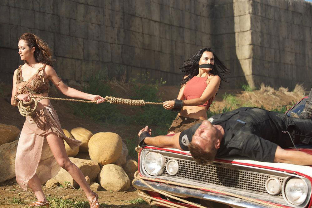 Au fil des épisodes, de nombreux lieux communs du cinéma d’exploitation des années 70 seront exploités afin d’enrichir une intrigue dont le cheminement est d’une simplicité extrême : cannibales, savants fous pratiquant des expériences scientifiques interdites, conglomérat industriel dominant le monde, etc. La série créée et développée par James Roland affiche une malice et un second degré rafraichissants ; l’ambiance est à la série B décomplexée, aux gags gras – mais souvent efficaces – ainsi qu’aux personnages badass, caricaturaux et ouvertement sexualisés, dont le rôle est tantôt réduit à une simple fonction dans le récit, tantôt beaucoup plus fouillé et attachant. Et au final, qu’est-ce que c’est bon ! Le duo de personnages principaux (incarnés par Christina Ochoa et Alan Ritchson) s’avère excellent et fonctionne à merveille, même si leurs interactions mettront 2/3 épisodes avant de trouver leur rythme de croisière. Bien sûr, on pourra toujours trouver que les courses-poursuites qui rythment les treize épisodes du show manquent un peu de variété et sont parfois mises en scène à la va-comme-je-te-pousse – il est vrai que c’est dans cet aspect précis que l’on perçoit clairement les limites du budget de Blood Drive, qui demeure néanmoins une expérience nerveuse, explosive, hilarante, bref en un mot absolument jouissive. D’autant qu’au niveau du « production design », l’ensemble affiche une tenue solide, avec des décors post-apocalyptiques convaincants, même si bien sûr on navigue dans le pur bis, le décor de série B volontairement fauché, dans le plus pur style des productions ritales 70’s, avec les traditionnels filtres à la Grindhouse.
